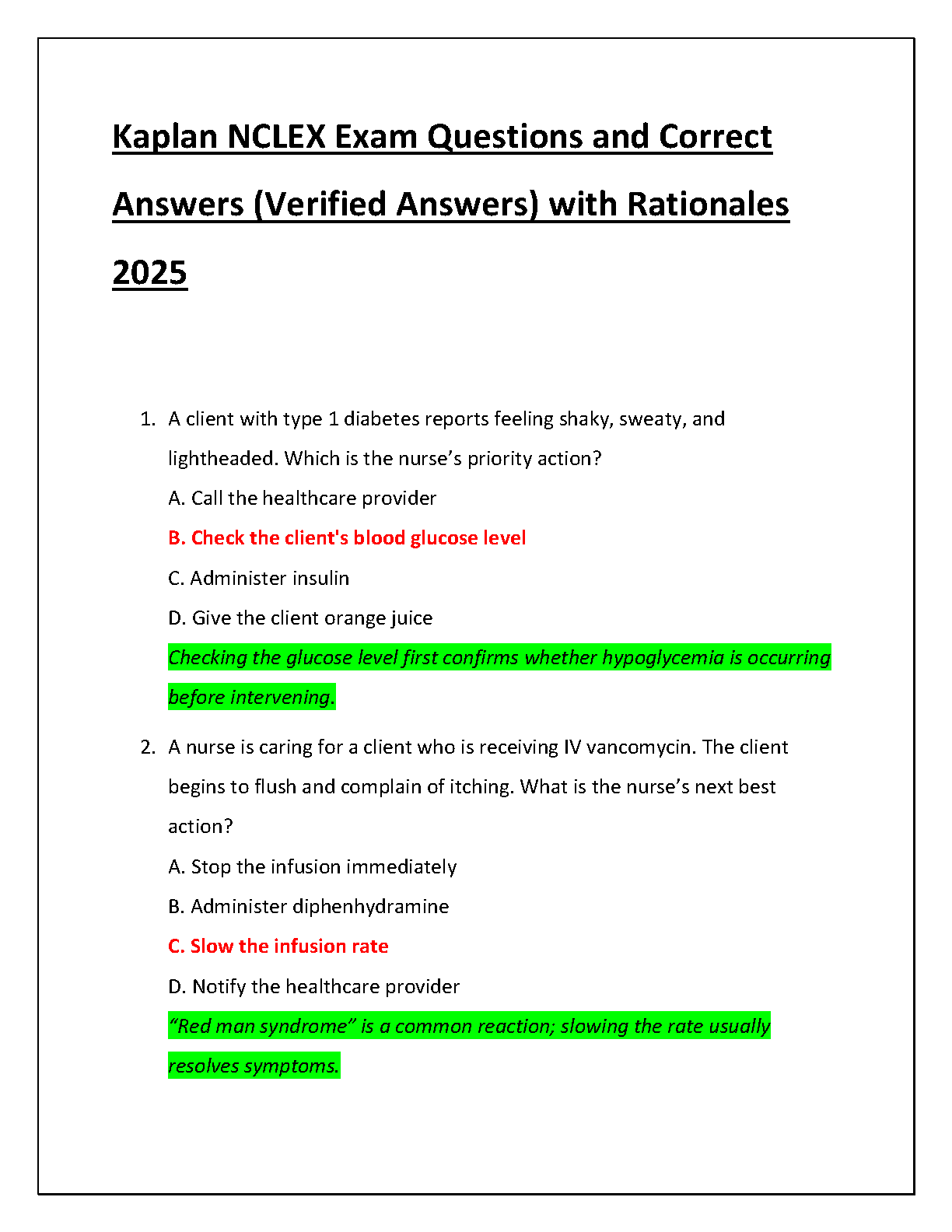 Kaplan NCLEX-RN 2025 Test Bank: Comprehensive Exam Questions with Verified Answers & Rationales for First-Time Pass