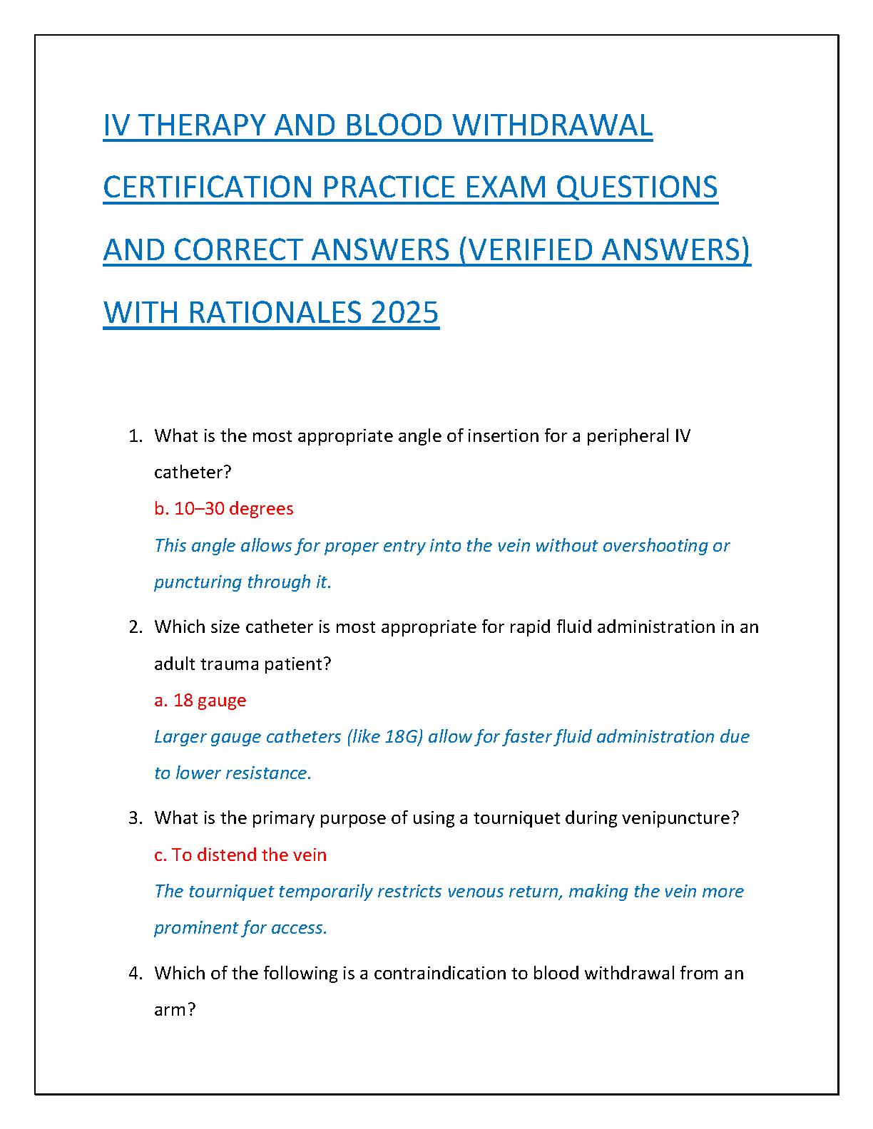 Ace your IV Therapy and Blood Withdrawal Certification exam on the very first try! This comprehensive 2025 test bank is meticulously crafted to give you the edge you need. It features a wide range of practice questions covering all critical topics, from proper catheter insertion techniques and gauge selection to tourniquet application and contraindications. Each question comes with a verified correct answer and a detailed rationale, helping you not just memorize facts but truly understand the 'why' behind each procedure. Stop worrying about resits—download this essential study guide to master the material and pass with confidence.