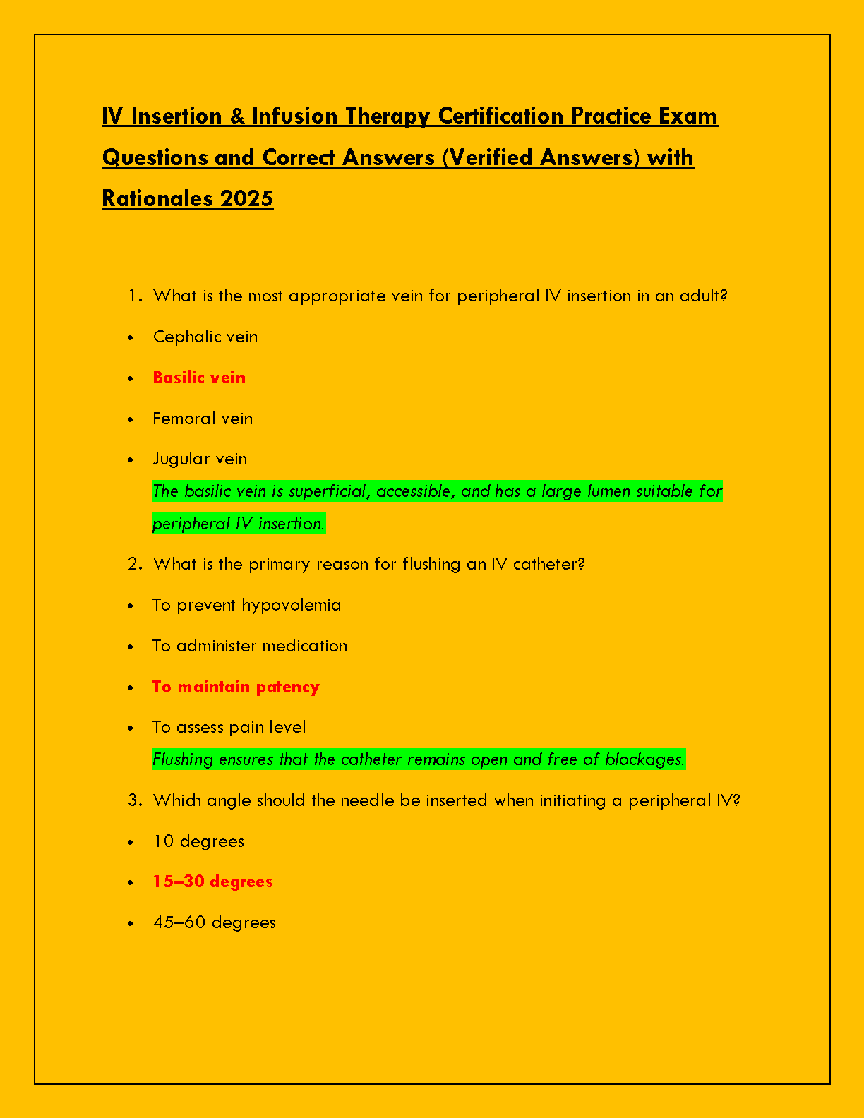 Ace your IV Insertion & Infusion Therapy Certification with this complete 2025 test bank. This essential study guide features a comprehensive collection of practice exam questions, each paired with verified correct answers and detailed rationales. Designed to deepen your understanding and build confidence, this resource covers all critical topics you'll face on the exam. Master the material, avoid resits, and pass your certification on the first attempt with this expertly crafted preparation tool.