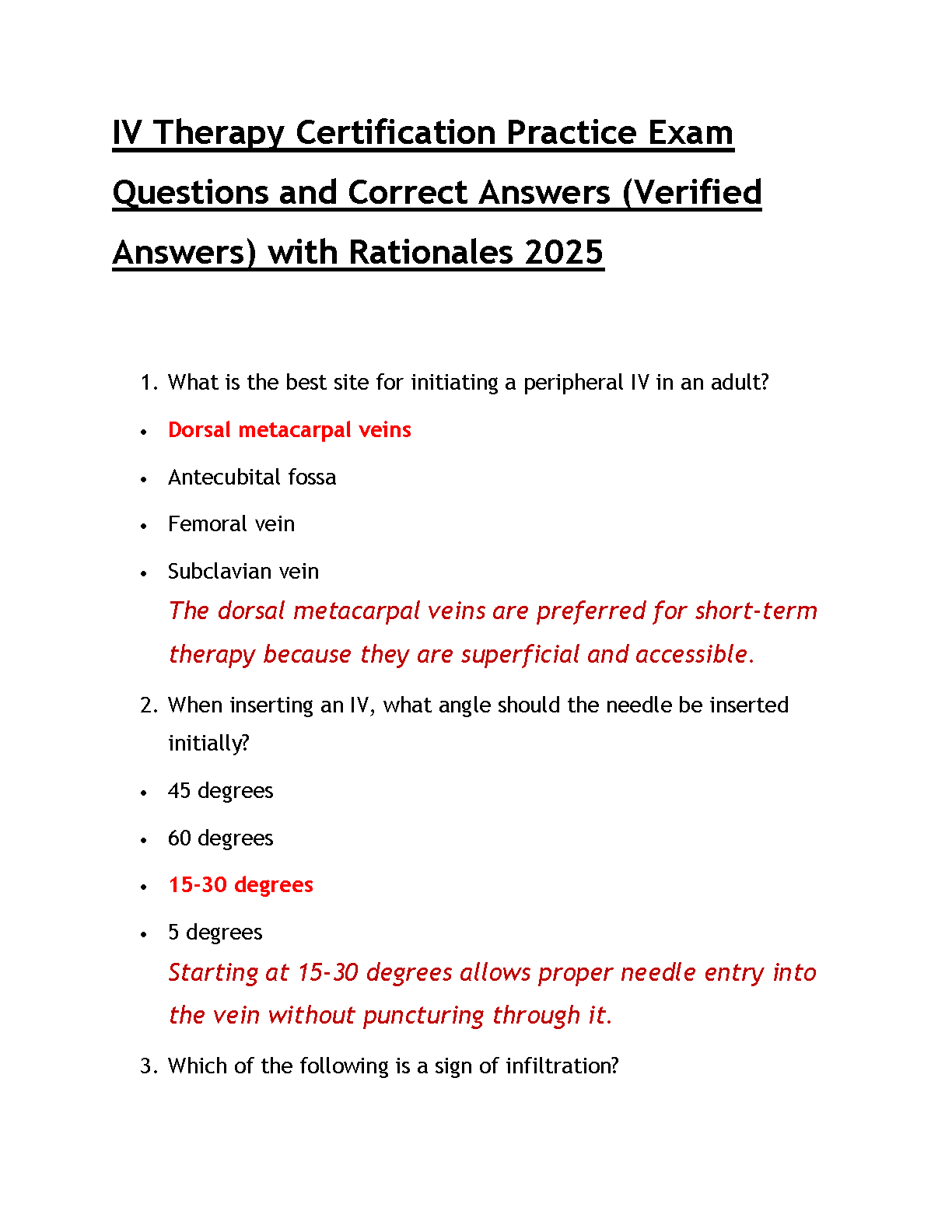 Prepare to excel in your IV Therapy Certification with our latest 2025/2026 practice exam test bank. This essential study guide features a comprehensive collection of questions meticulously crafted to mirror the actual certification exam. Each question is paired with a verified correct answer and a detailed rationale, explaining the clinical reasoning behind it. By mastering topics such as optimal IV site selection, correct insertion techniques, and complication management, you'll gain the confidence and knowledge needed to pass on your first attempt. Stop worrying about resits and start your path to certification success today!