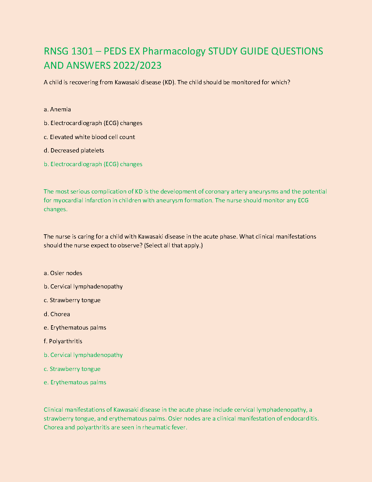 Master your RNSG 1301 Pediatric Pharmacology course with this ultimate study resource for the 2025/2026 academic year. This comprehensive test bank is meticulously designed to help you ace your exams on the first attempt. It features a wide range of practice questions covering key topics, including complex conditions like Kawasaki disease, each paired with detailed, easy-to-understand rationales. Stop struggling and start studying smarter. This guide provides the exact material you need to build confidence, deepen your understanding, and achieve exam success in pediatric pharmacology.
