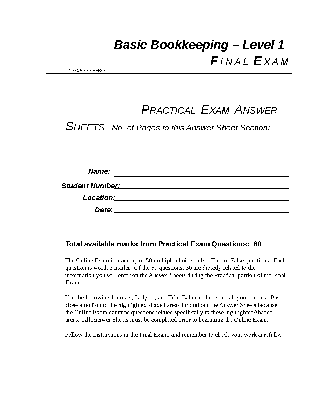 Test Bank for Basic Bookkeeping Level 1: Complete Final Exam with Practical Answer Sheets