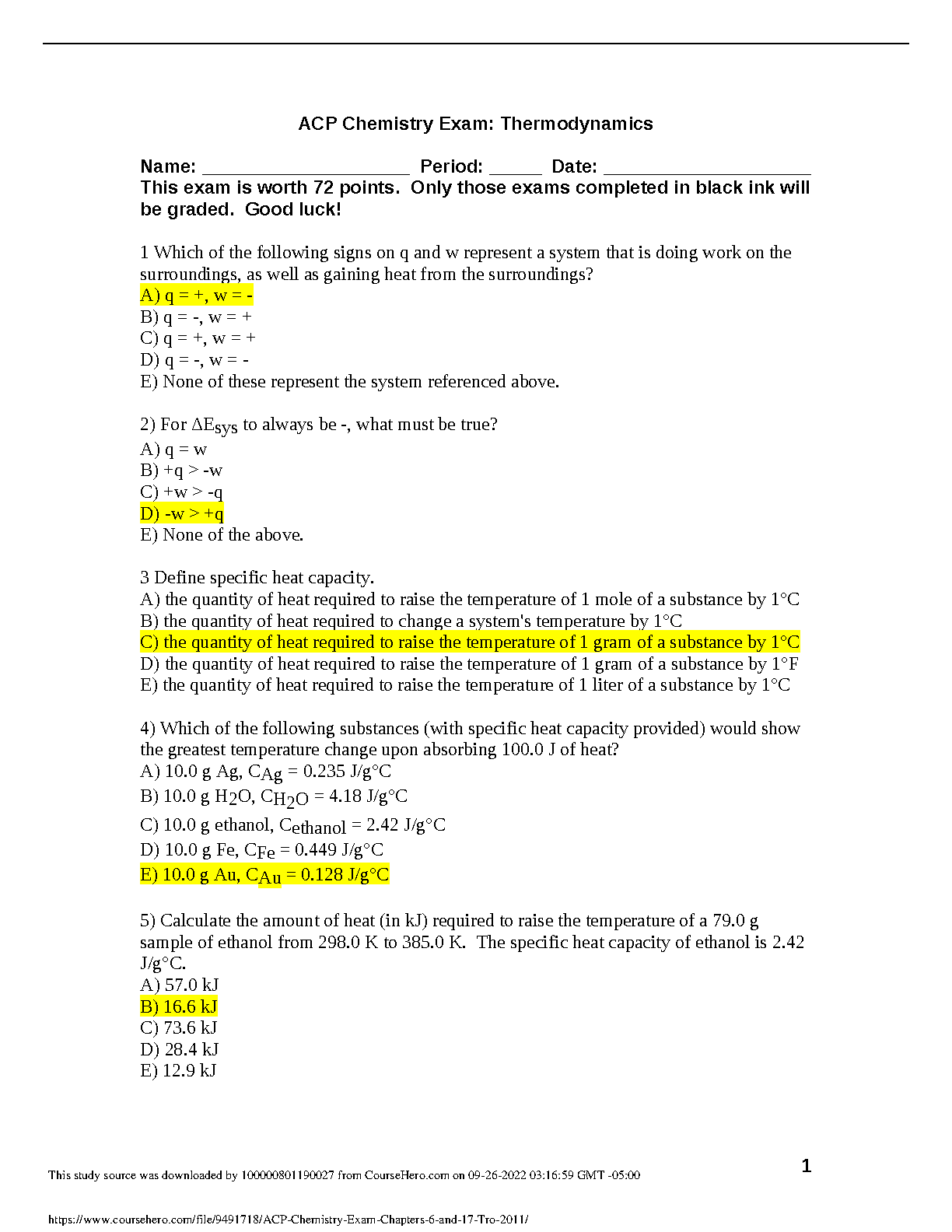 Chemistry: A Molecular Approach (Tro, 2nd Edition) Test Bank - Chapters 6 & 17 Thermodynamics Exam with Solutions
