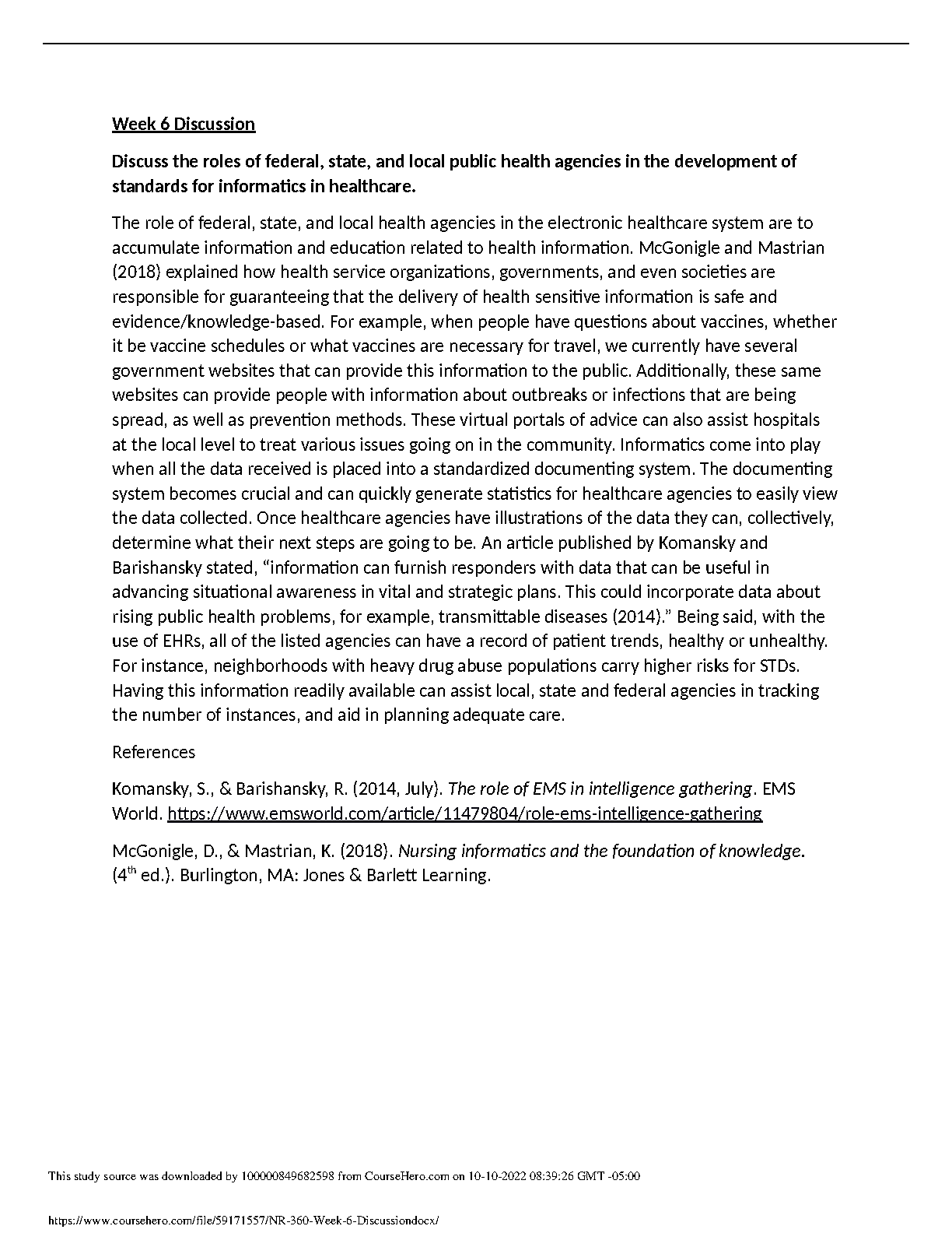 Get the ultimate study resource for NR 360 with this comprehensive Week 6 Discussion answer, updated for the 2025/2026 academic year. This guide provides a detailed analysis of the crucial roles federal, state, and local public health agencies play in developing standards for healthcare informatics. Drawing key insights from 'Nursing Informatics and the Foundation of Knowledge' (4th Edition) by Dee McGonigle and Kathleen G. Mastrian, this document explores how these agencies utilize electronic systems to manage public health, from tracking vaccine schedules to preventing disease outbreaks. This is the perfect tool to understand complex concepts, ace your assignments, and pass your exams on the first try, helping you avoid costly resits.