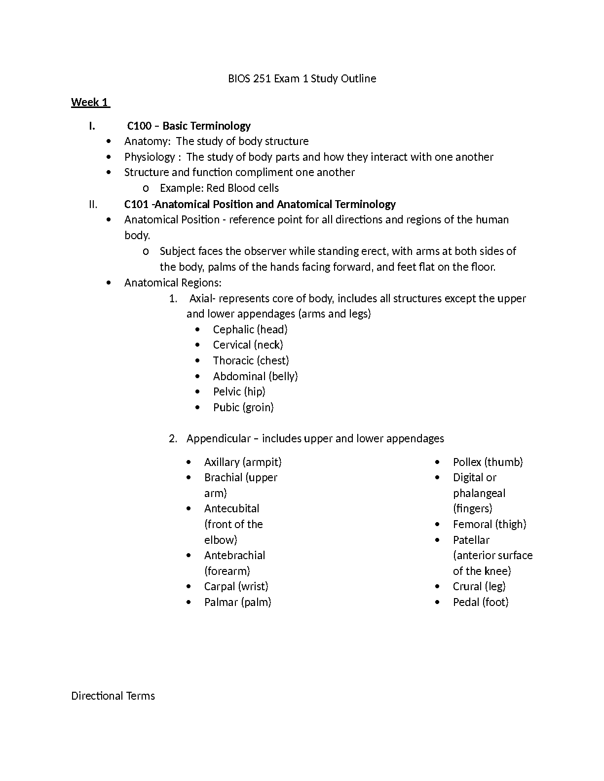 Ace your BIOS 251 Exam 1 with our expertly crafted study outline, fully updated for the 2025/2026 academic year. This resource is designed to help you master foundational Anatomy and Physiology concepts, ensuring you pass on your first attempt. It covers all essential Week 1 topics: basic terminology, the anatomical position, and a comprehensive list of axial and appendicular regions. Master everything from cephalic to pedal terminology and build a strong foundation for success.
