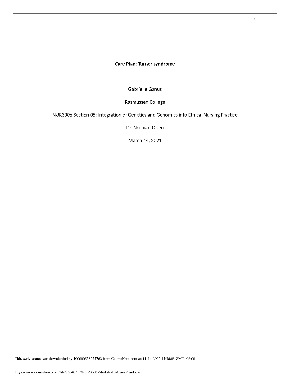 NUR3306 Integration of Genetics: Turner Syndrome Care Plan Case Study | Rasmussen College | 2025/2026 A+ Guide