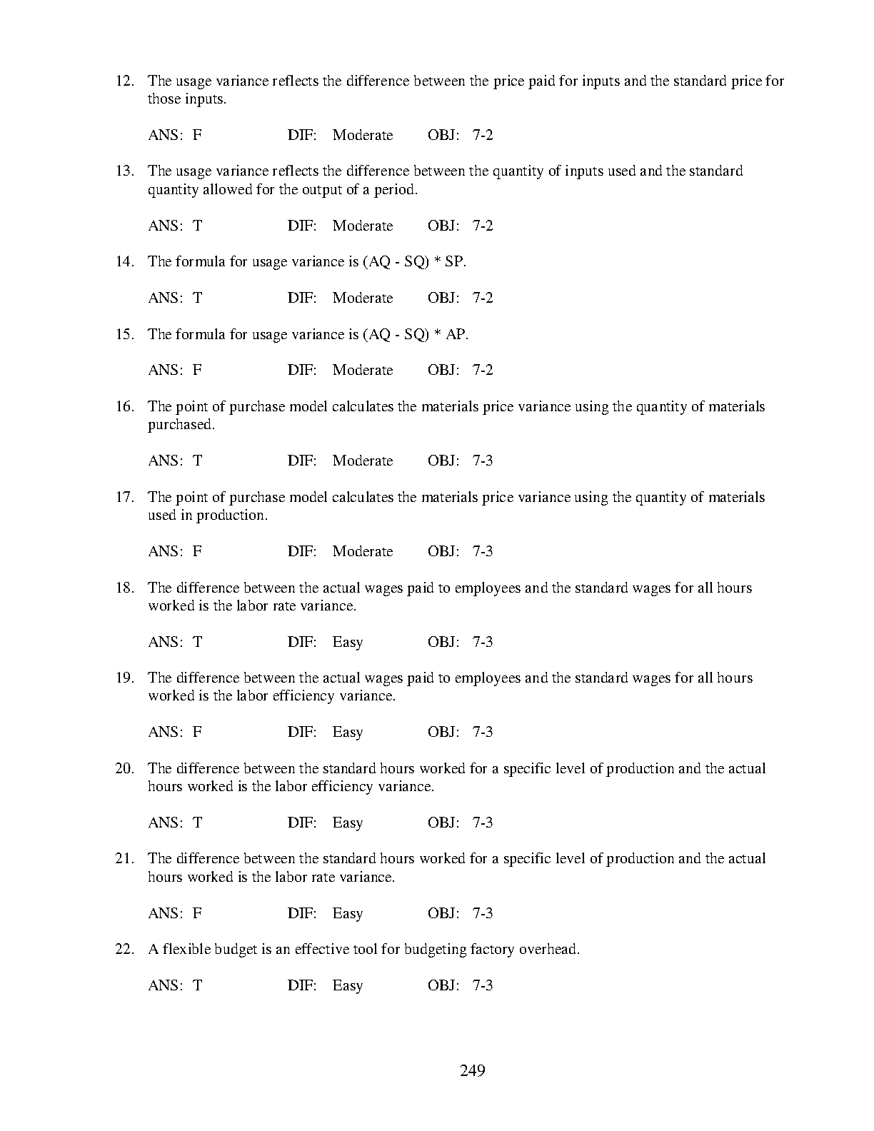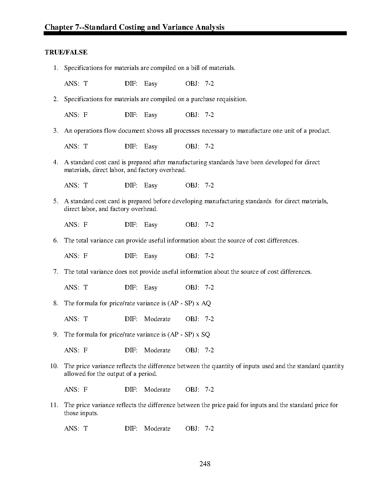 Access the complete and verified test bank for Chapter 7, Standard Costing and Variance Analysis, from 'Cost Accounting: Foundations and Evolutions, 9th Edition' by Michael R. Kinney and Cecily A. Raiborn. This resource provides a comprehensive set of questions, complete with detailed answers and difficulty ratings, designed to help you master key concepts. Excel in your accounting exams by practicing with these targeted questions on material specifications, standard cost cards, price/rate variance, and more. A perfect study tool for acing your tests and understanding the core principles of variance analysis.