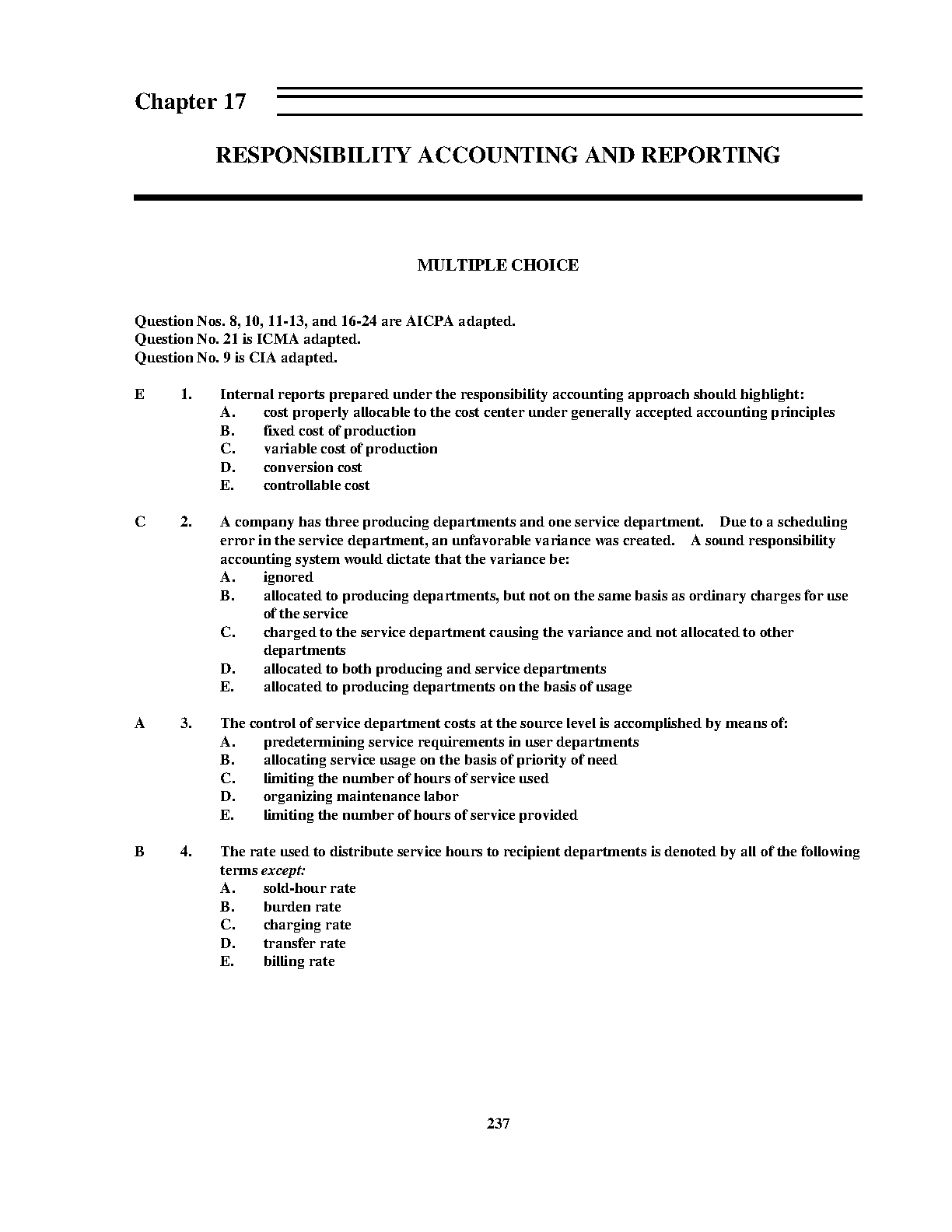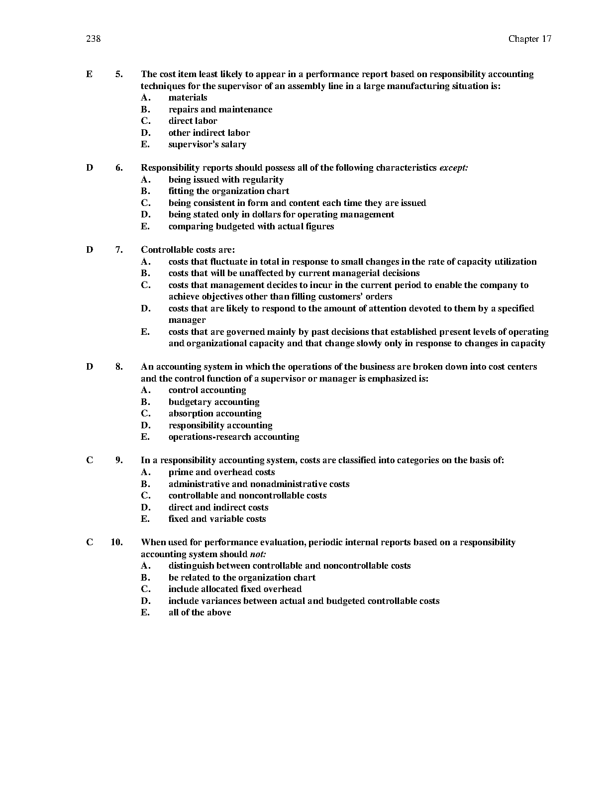 Unlock academic success with the complete test bank for Chapter 17, 'Responsibility Accounting and Reporting,' from the 9th Edition of 'Cost Accounting: Foundations and Evolutions' by Kinney and Raiborn. This resource is packed with a comprehensive set of exam-style multiple-choice questions and detailed, verified answers. It is specifically designed to help you master complex topics, practice effectively for your exams, and gain the confidence to achieve a high grade on your first attempt. Instantly download this essential study guide to master responsibility accounting principles today.