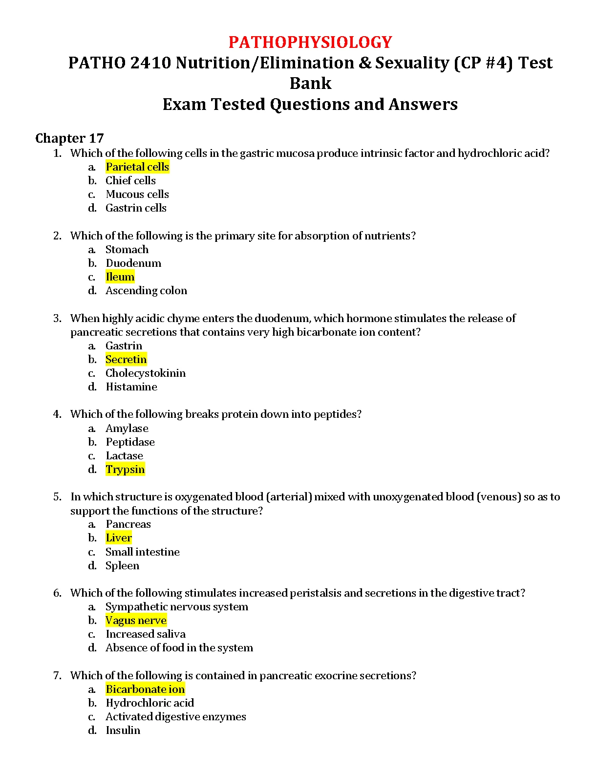 PATHO 2410 Nutrition/Elimination & Sexuality (CP #4) Test Bank Exam Tested Questions and Answers COMPLETE AND LATEST SOLUTION