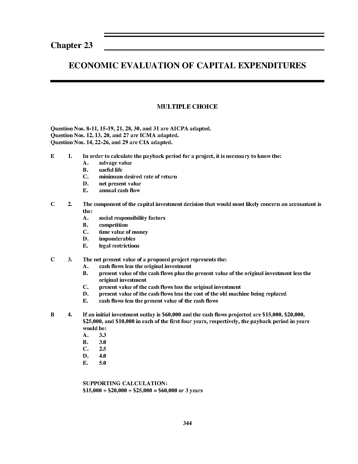 Access the complete and verified test bank for Chapter 23, 'Economic Evaluation of Capital Expenditures,' from 'Cost Accounting: A Managerial Emphasis, 16th Edition' by Horngren, Datar, and Rajan. This essential study resource provides a comprehensive collection of multiple-choice questions, complete with detailed answers and supporting calculations. Master key concepts such as payback period, net present value, and capital investment analysis to excel in your exams. This test bank is designed to help you practice effectively, understand complex topics, and achieve top grades in your accounting course.