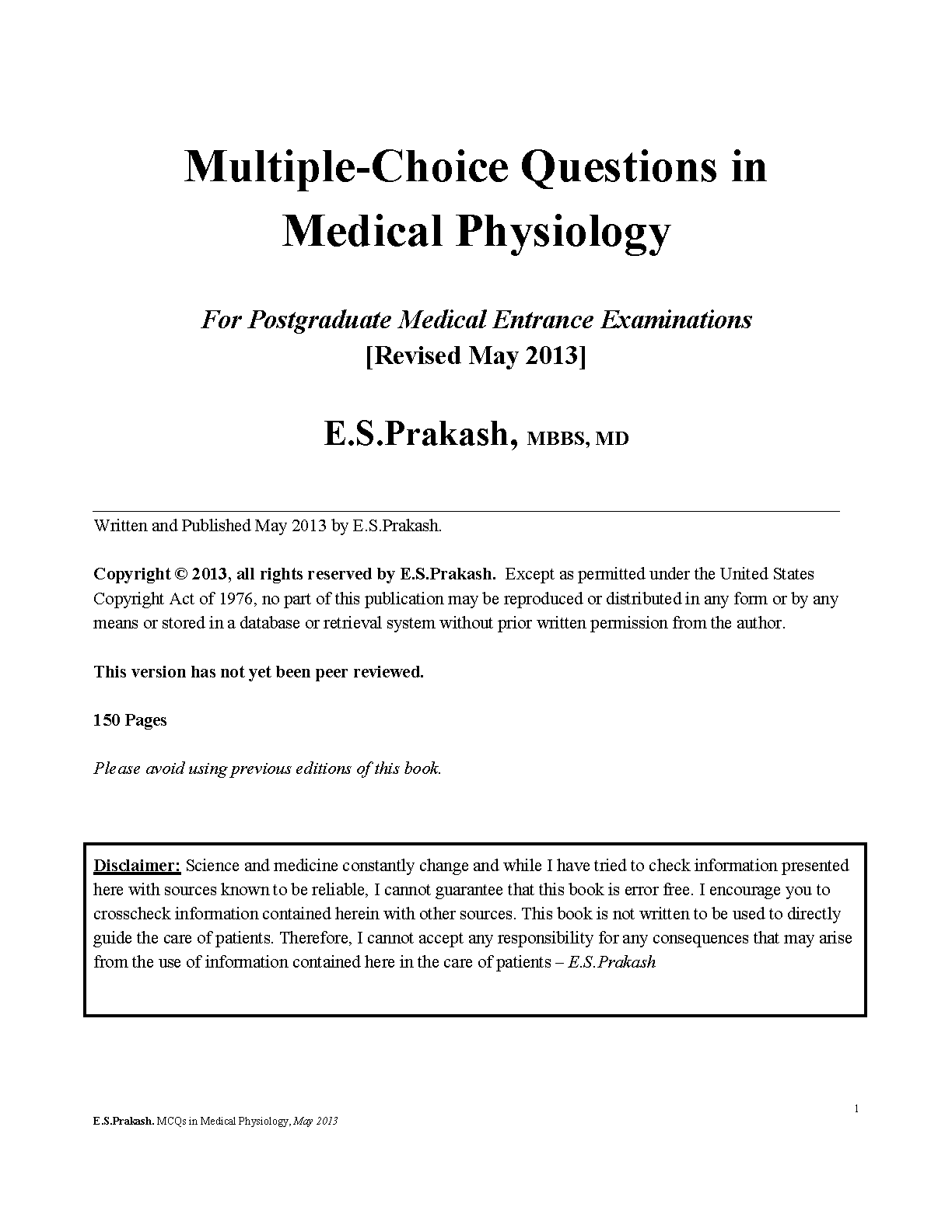 Master Medical Physiology: Test Bank for MCQs by E.S. Prakash (Revised May 2013 Edition)