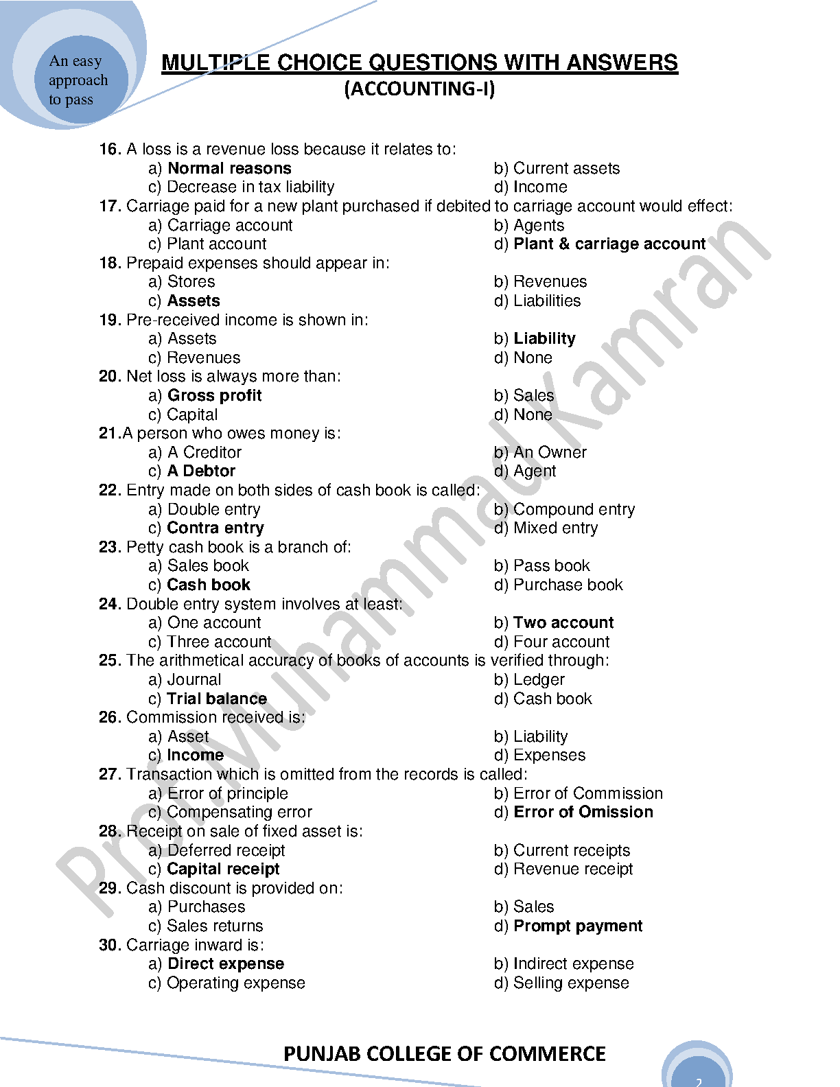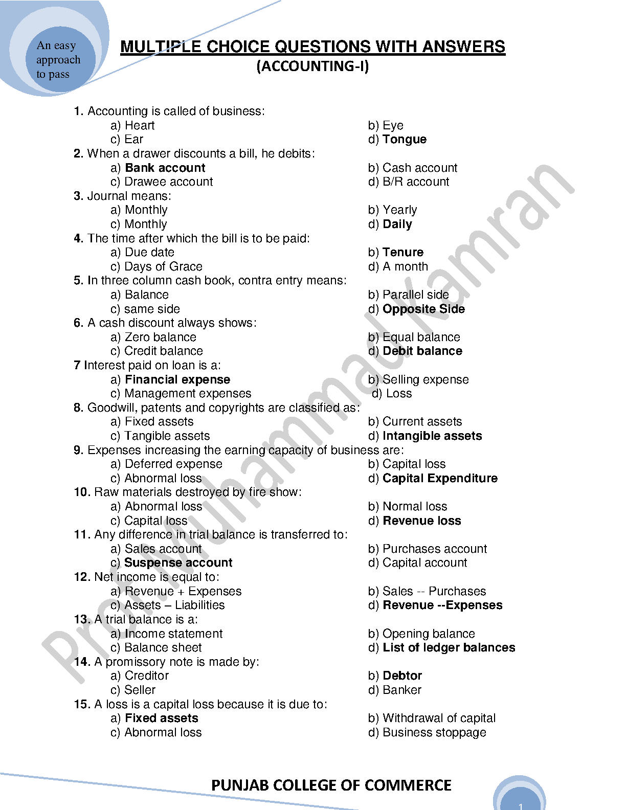 Principles of Accounting-I Test Bank by Sohail Afzal & M. Arif Ch. - Latest Edition MCQs with Solutions