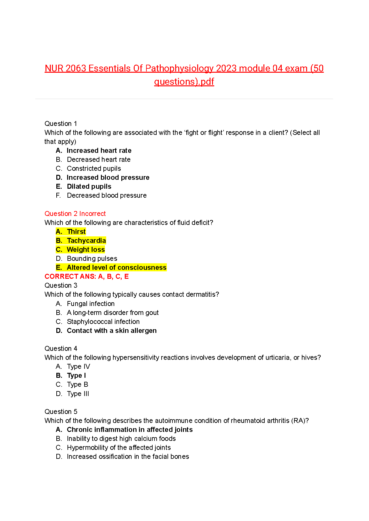 Instantly download the complete test bank for the NUR 2063 Essentials of Pathophysiology Module 4 Exam. This resource contains 50 exam-style questions with detailed, verified answers to help you deeply understand key concepts and excel in your nursing studies. Master topics such as the 'fight or flight' response, fluid deficits, contact dermatitis, and autoimmune conditions. This study guide is expertly crafted to boost your confidence, streamline your revision process, and ensure you pass your exam with flying colors.