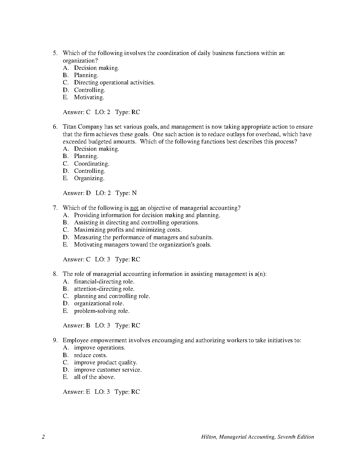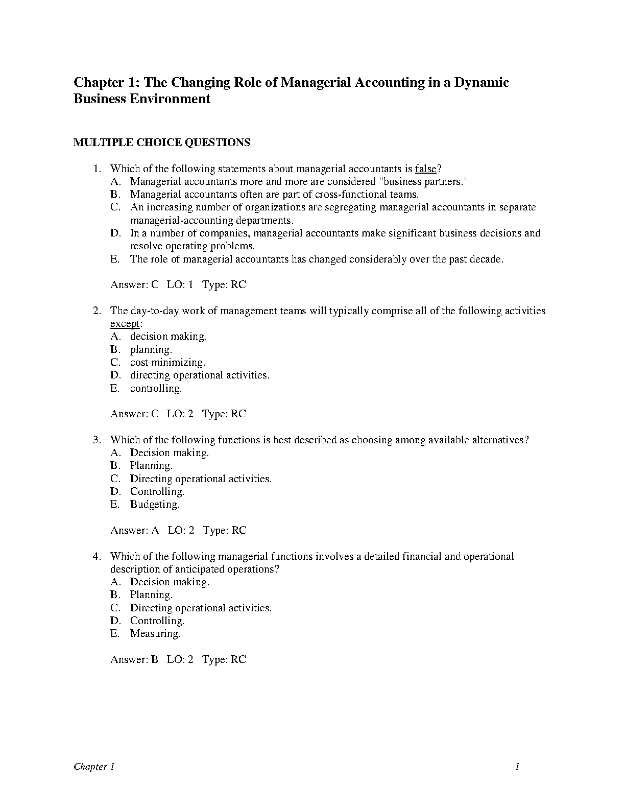 Instantly access the official test bank for Chapter 1 of 'Managerial Accounting, 13th Edition' by Hilton, Platt, and Maher. This chapter, focusing on 'The Changing Role of Managerial Accounting in a Dynamic Business Environment,' is covered in detail through a comprehensive set of multiple-choice questions complete with verified answers. Ideal for students aiming to master key concepts and excel in their exams. Download now to test your understanding and get a head start on your studies.