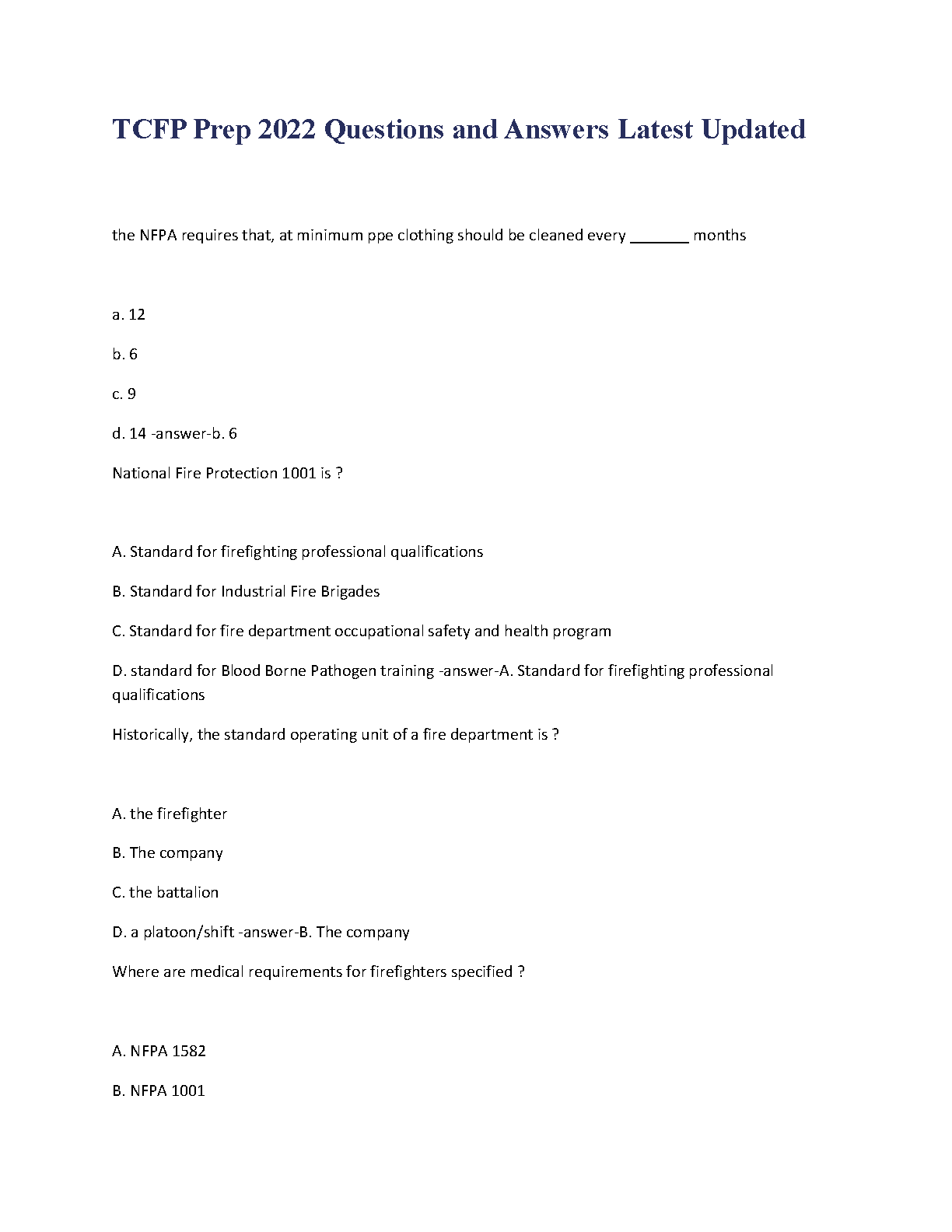 Master the TCFP certification exam with our comprehensive test bank for the 2025-2026 academic year. This meticulously curated resource features the latest questions and detailed, verified answers covering all critical areas, including NFPA standards, firefighter safety protocols, PPE requirements, and fire department operations. Designed to help you study effectively and confidently, our TCFP prep guide is your key to acing the exam on your first attempt and avoiding costly resits. Get instant access and start your journey to becoming a certified firefighter today!