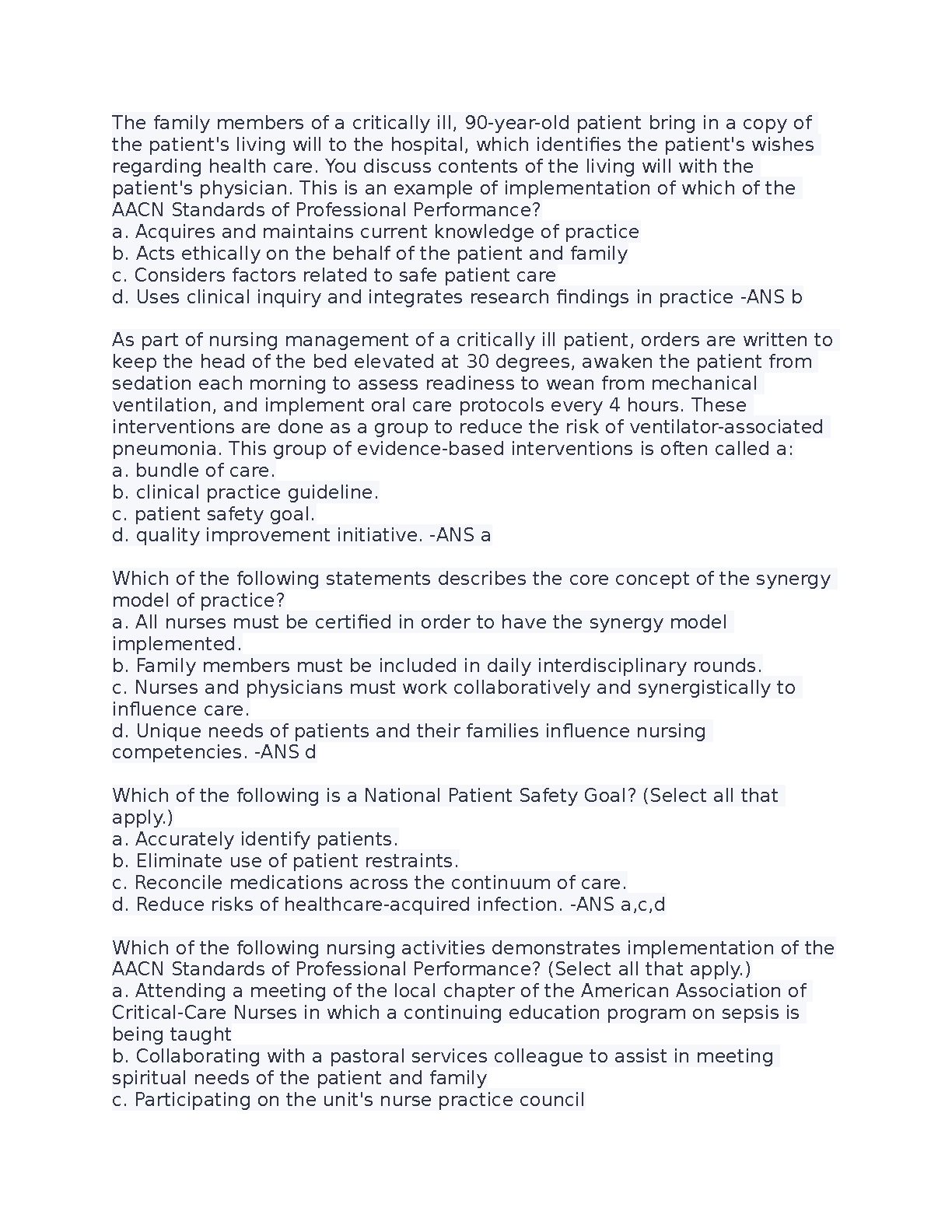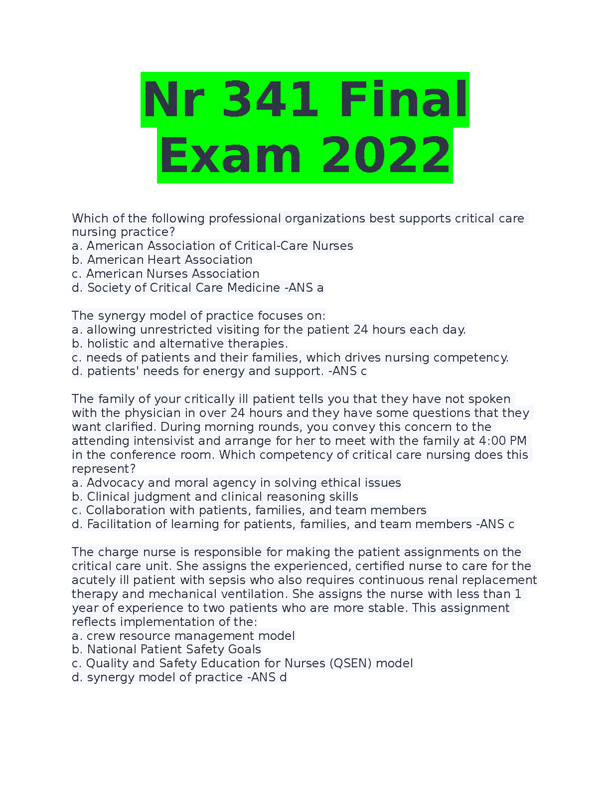 Get ready to excel in your NR 341 Critical Care Nursing final exam with our ultimate study guide for the 2025-2026 academic year. This resource is packed with a comprehensive set of exam questions and meticulously verified answers, covering all critical topics from the course. Dive into key concepts like the synergy model, professional nursing organizations, QSEN, and critical care competencies. Our guide is expertly designed to help you master the material, boost your confidence, and pass your final exam on the very first attempt. Stop stressing and start studying smart with the tools you need for success!