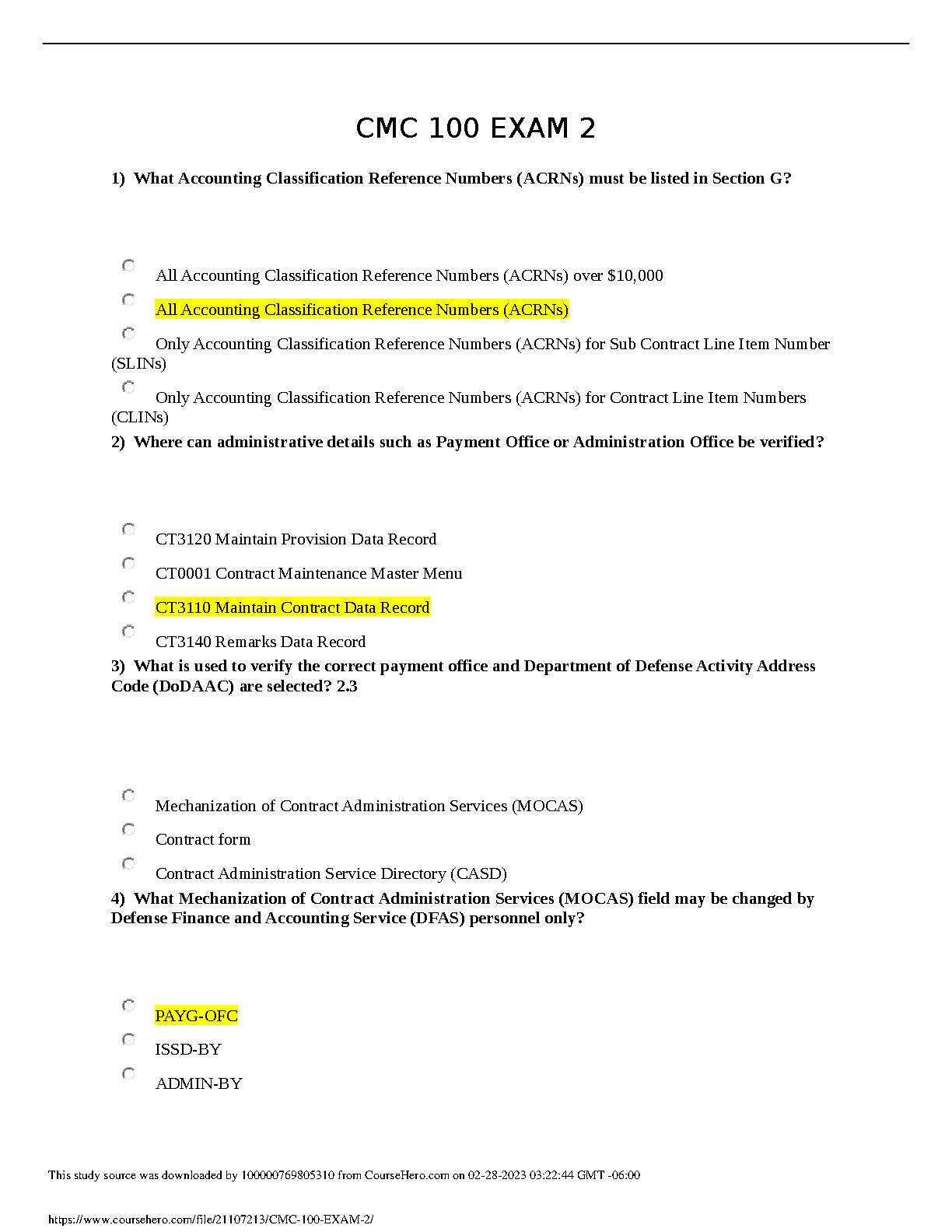 Get fully prepared for your CMC 100 Exam 2 with this complete test bank. Featuring a comprehensive collection of questions with verified answers, this study guide covers all essential topics from the Mechanization of Contract Administration Services (MOCAS) Payment Overview course. Deepen your understanding of key concepts including Accounting Classification Reference Numbers (ACRNs), Defense Finance and Accounting Service (DFAS) protocols, and administrative data verification. This resource is designed to help you study effectively and master the material needed to succeed on your exam.
