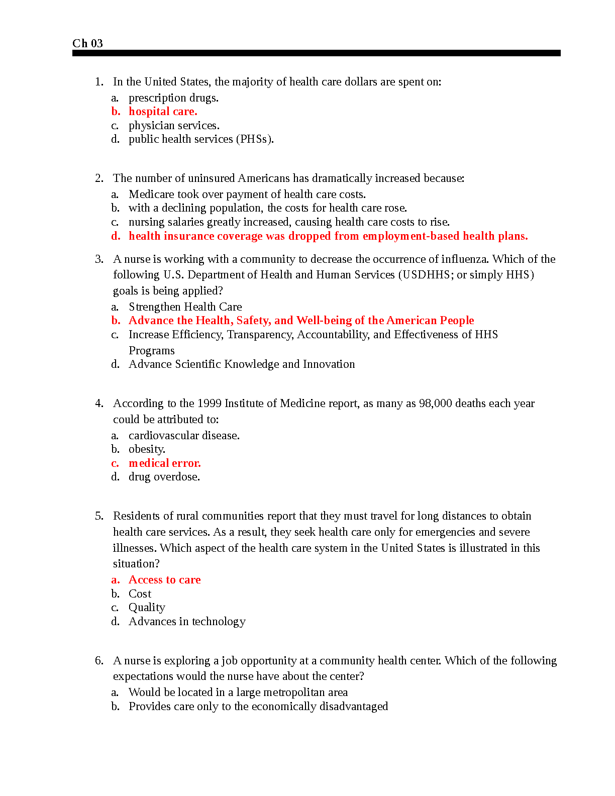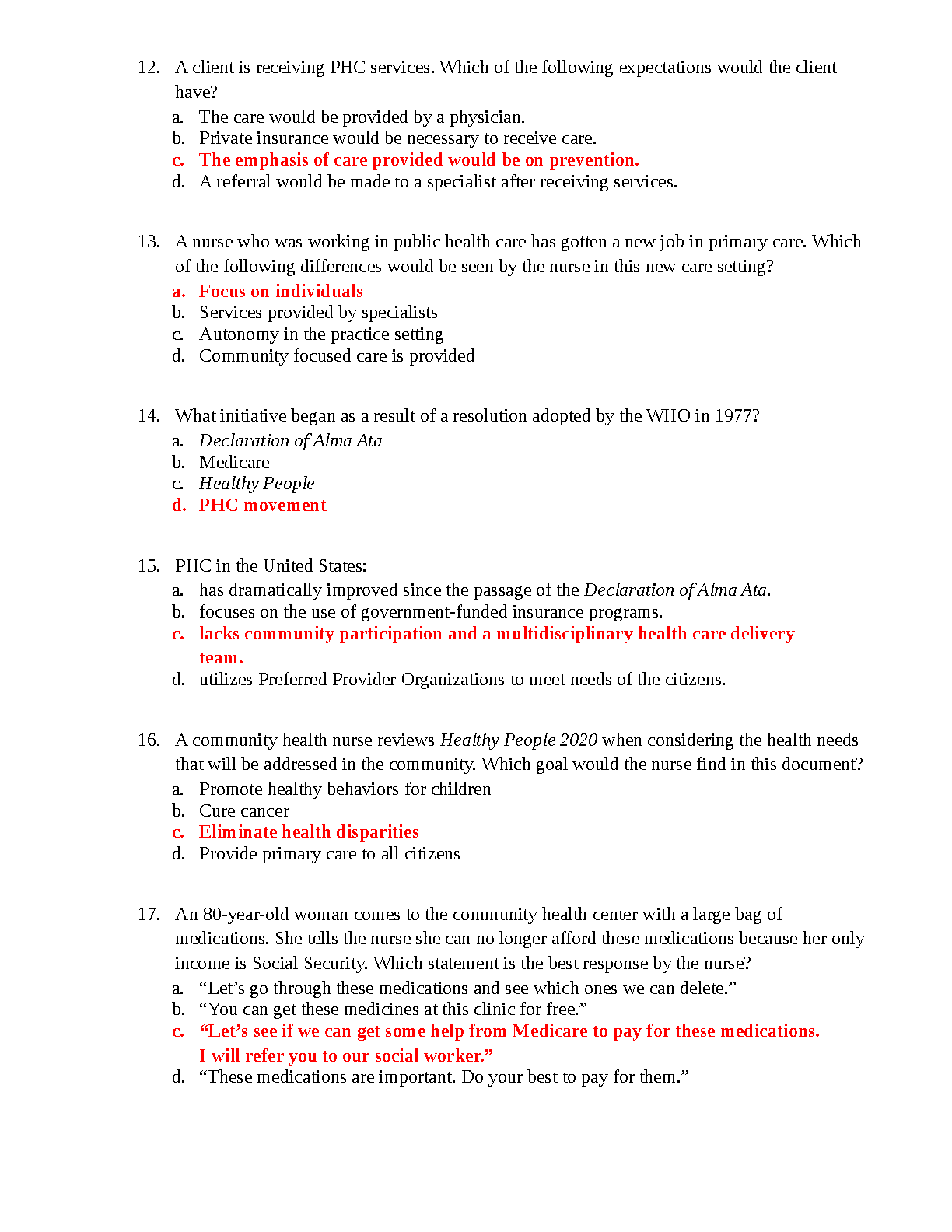 Achieve top grades in your nursing course with the complete Test Bank for 'Community/Public Health Nursing: Promoting the Health of Populations,' 7th Edition, by renowned authors Mary A. Nies and Melanie McEwen. This indispensable study aid provides a vast collection of exam-style questions with verified answers for every chapter, mirroring the sample provided from Chapter 3 on the U.S. Health Care System. It's expertly designed to help you master key concepts, prepare effectively for exams, and excel in your public health nursing studies. Get instant access to this essential resource and confidently prepare to pass your exams on the first try.