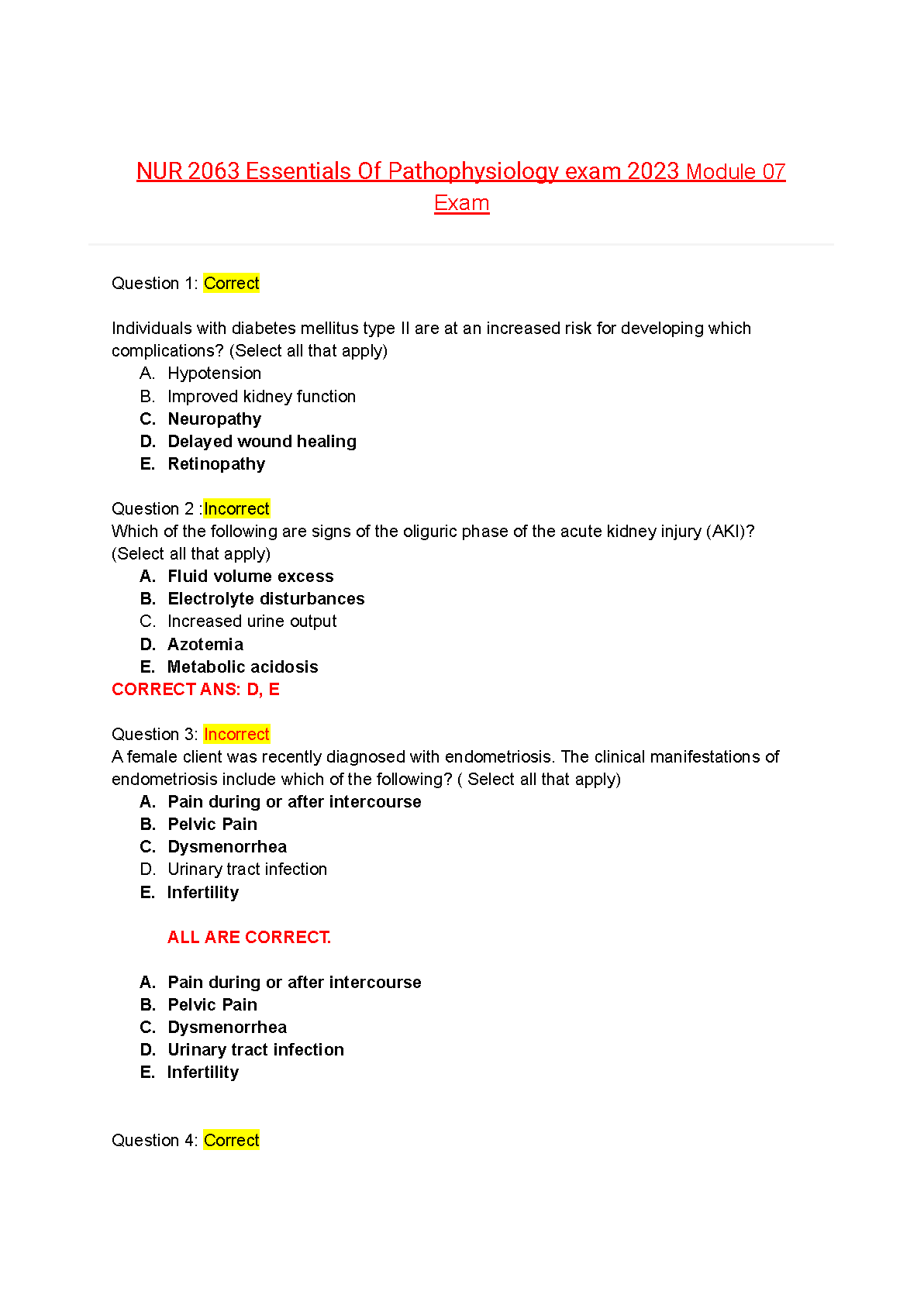 Ace your NUR 2063 Module 07 exam with this comprehensive test bank for 'Essentials of Pathophysiology: Concepts of Altered Health States, 5th Edition' by Porth and Matfin. This resource provides a complete set of exam questions along with detailed, verified correct answers. It's the ultimate study tool to master key pathophysiology concepts, practice with real exam-style questions, and boost your confidence. Prepare effectively, understand the material deeply, and pass your exam on the first try!