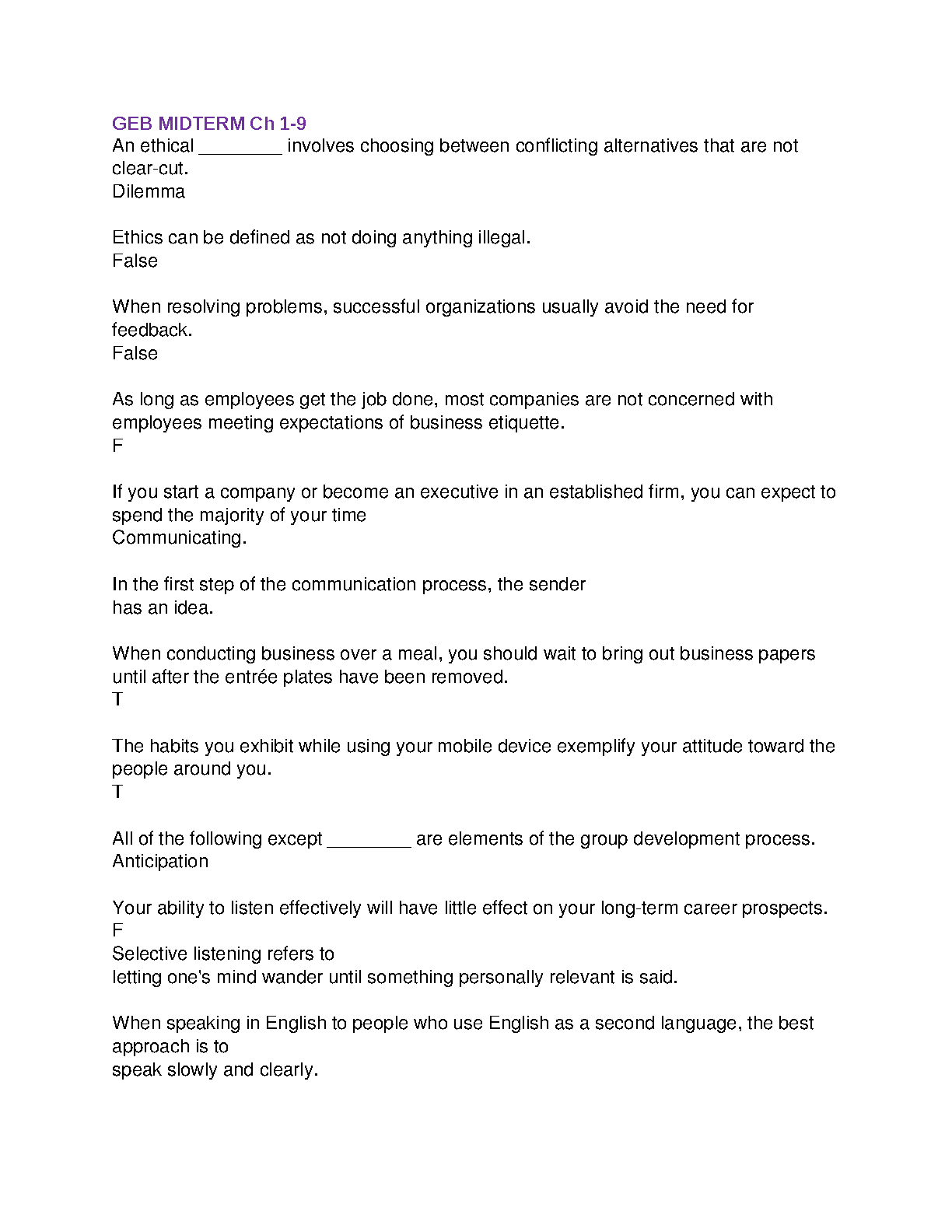 Ace your GEB Midterm exam with this complete test bank covering all key topics from Chapters 1-9 of Bovee and Thill's 'Business Communication Today', 15th Edition. This essential study resource provides a vast collection of exam-style questions with verified answers, focusing on concepts like business ethics, communication processes, team dynamics, and professional etiquette. Prepare effectively, boost your confidence, and secure a top grade with this indispensable guide.