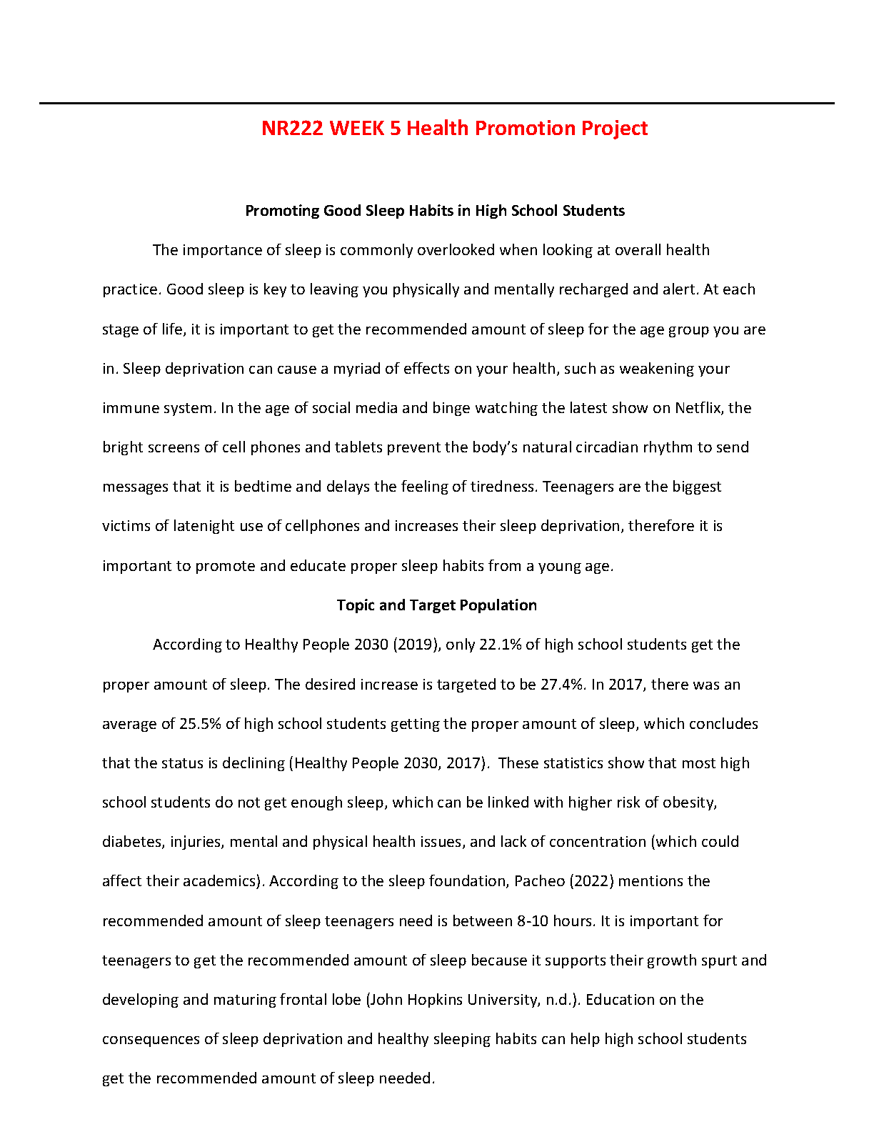 NR222 Week 5 Health Promotion Project: Promoting Good Sleep Habits in High School Students | A+ Grade Study Guide 2025/2026