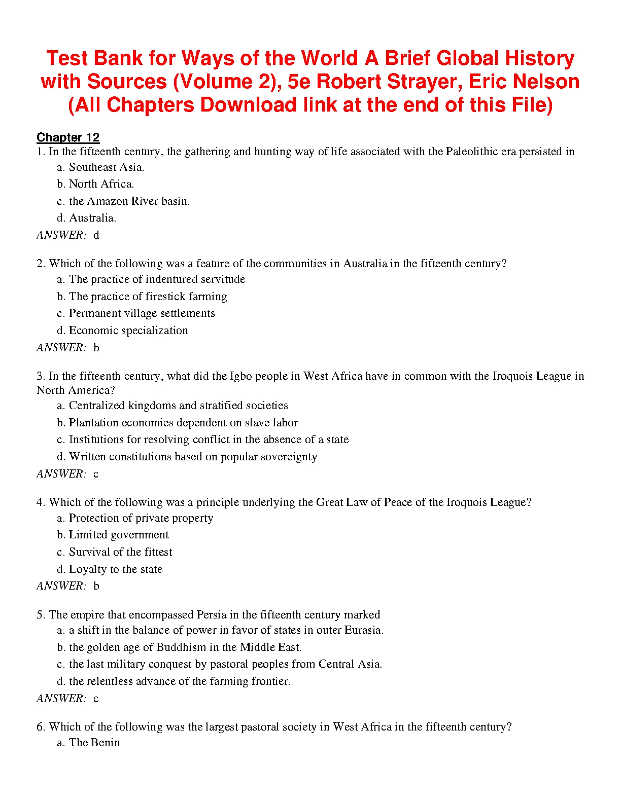 Test Bank for Ways of the World A Brief Global History with Sources (Volume 2), 5TH EDITION BY Robert Strayer, Eric Nelson. DOWNLOAD on www.hackedexams.com INSTANTLY.