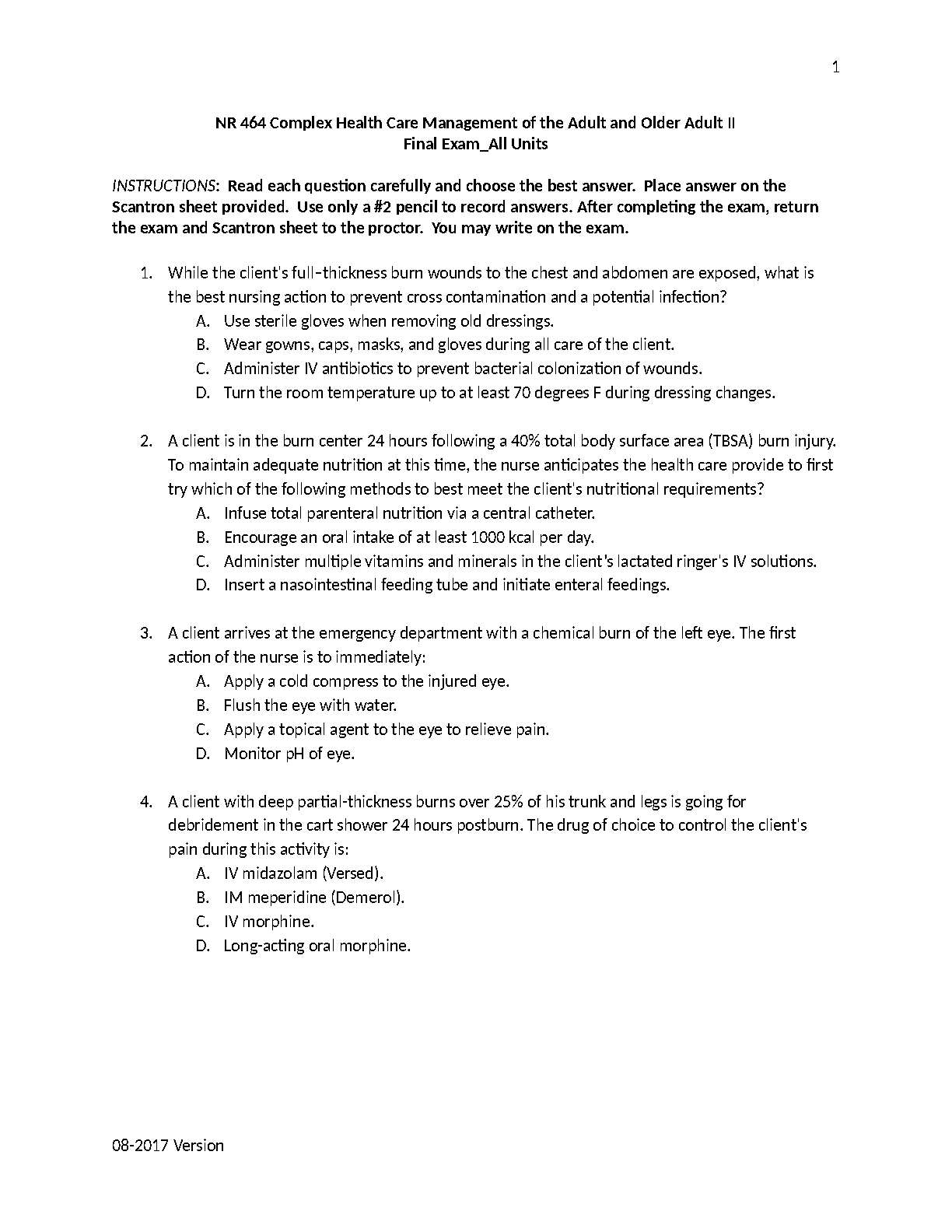 Unlock your potential and ace your NR 464 final exam with this comprehensive test bank for Complex Health Care Management of the Adult and Older Adult II. This essential study guide is meticulously aligned with the core curriculum and key concepts from the 12th Edition of 'Medical-Surgical Nursing' by Harding et al. It features a complete collection of exam-style multiple-choice questions covering all units, including critical topics like advanced burn management, emergency care, and complex patient scenarios. By practicing with these targeted questions, you can sharpen your clinical reasoning, identify areas for improvement, and build the confidence needed to excel in your nursing program and pass your final exam on the first try.