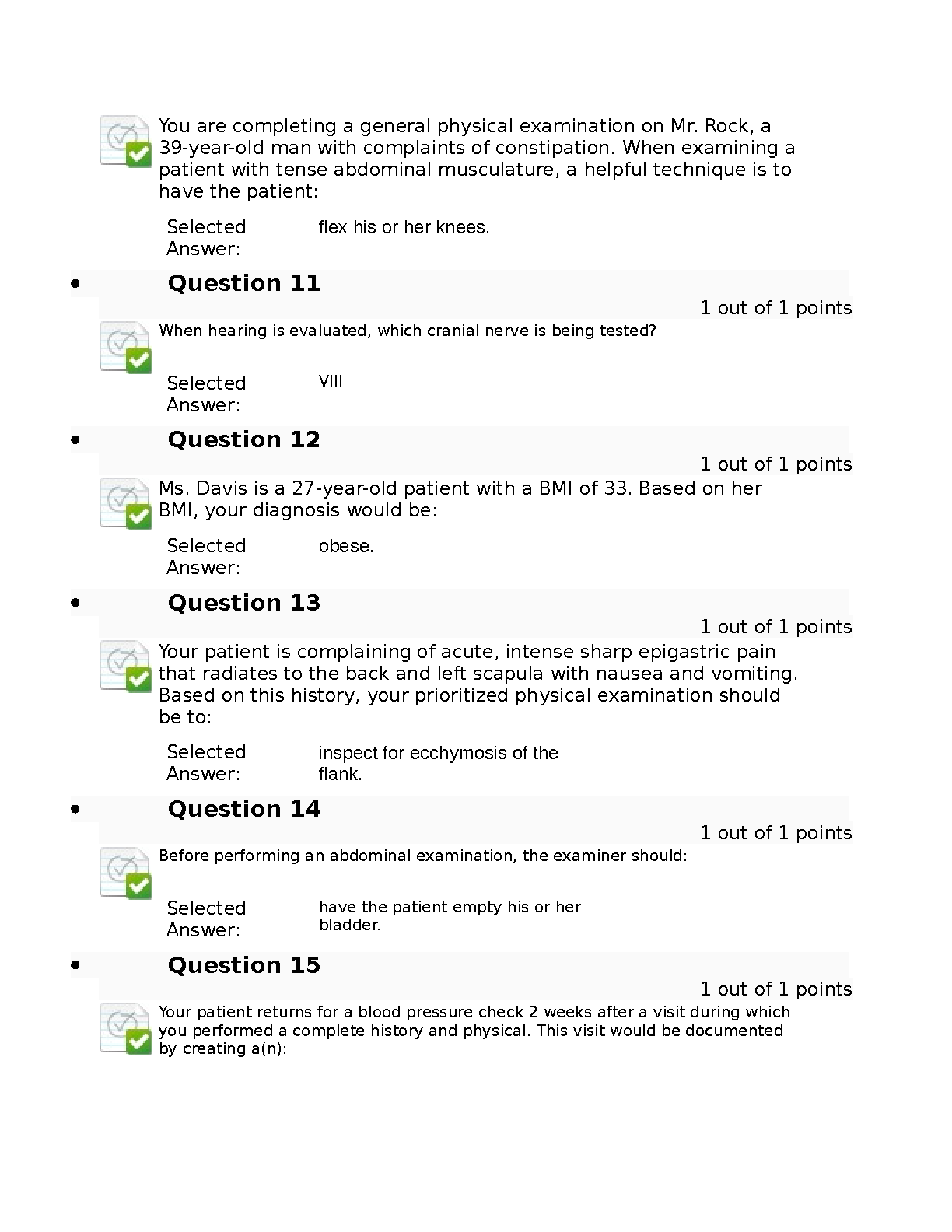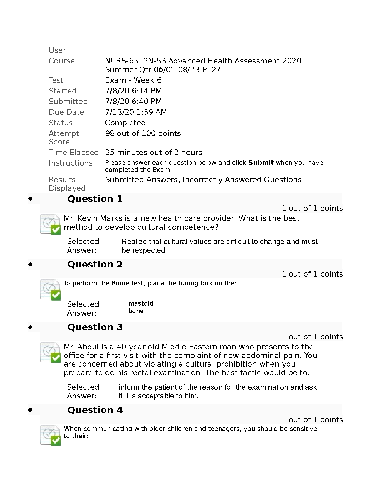 Unlock academic success in your NURS 6512N Advanced Health Assessment course with this comprehensive test bank for the 6th Edition of 'Advanced Health Assessment & Clinical Diagnosis in Primary Care' by Dains, Baumann, and Scheibel. This invaluable resource features a wide array of exam-style questions and verified correct answers, directly mirroring the content from your Week 6 exam and beyond. Gain the confidence to excel by mastering key concepts in cultural competence, physical examination techniques, and clinical diagnosis. This study guide is expertly designed to help you prepare effectively, achieve top scores like the 98/100 shown, and pass your course with flying colors.