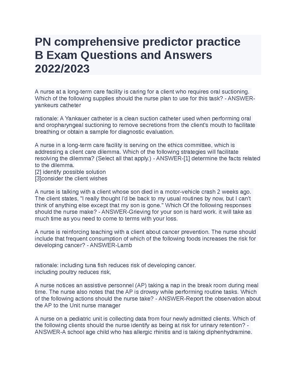 Ace your nursing exams with the ATI PN Comprehensive Predictor B 2023 Test Bank. This essential study guide provides a complete set of practice questions, each paired with detailed answers and rationales. Covering a wide range of critical nursing topics such as long-term care procedures, ethical dilemmas, patient counseling, pediatrics, and staff management, this resource is designed to mirror the actual exam format. Master the material, understand the reasoning behind each correct answer, and build the confidence you need to pass your NCLEX-PN on the first try. Get immediate access to this invaluable tool and take the final step towards becoming a licensed Practical Nurse.