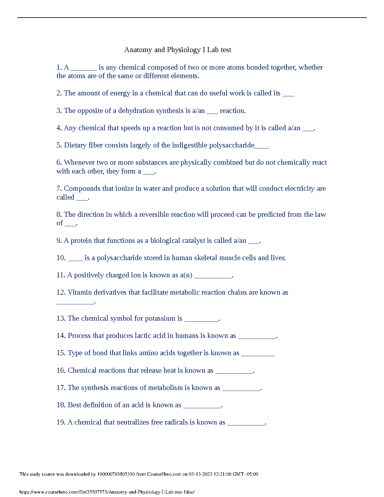 Anatomy & Physiology, 12th Edition (Elaine N. Marieb & Katja Hoehn) Test Bank - A&P I Lab Test Questions
