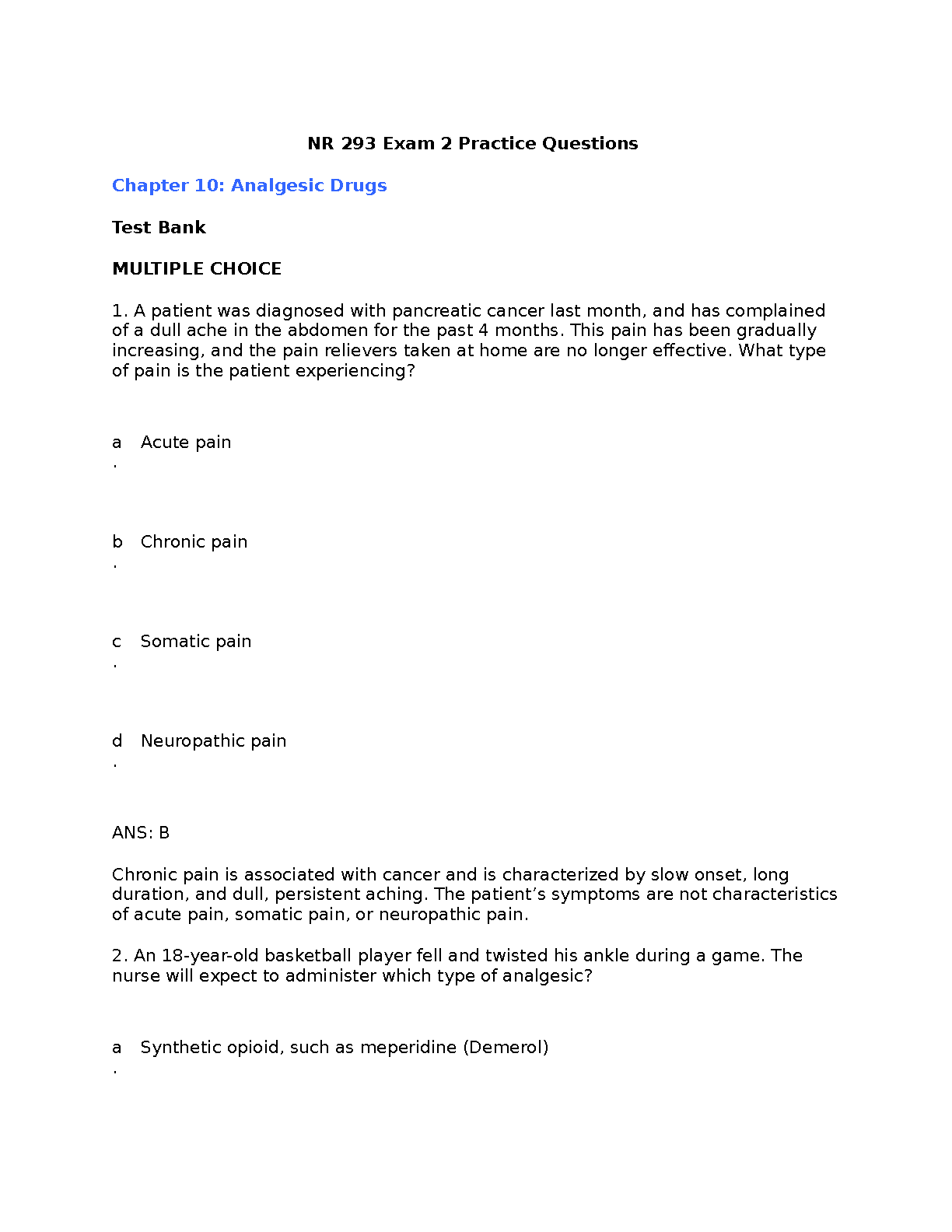 Master the complexities of pain management and ace your NR 293 Exam 2 with this comprehensive test bank for Chapter 10: Analgesic Drugs. Sourced from the 10th Edition of 'Pharmacology and the Nursing Process,' this guide provides a wealth of practice questions with detailed answers and rationales. It's the ultimate study tool designed to deepen your understanding of analgesic medications and clinical scenarios, ensuring you're fully prepared to pass your exam with confidence on the first attempt.