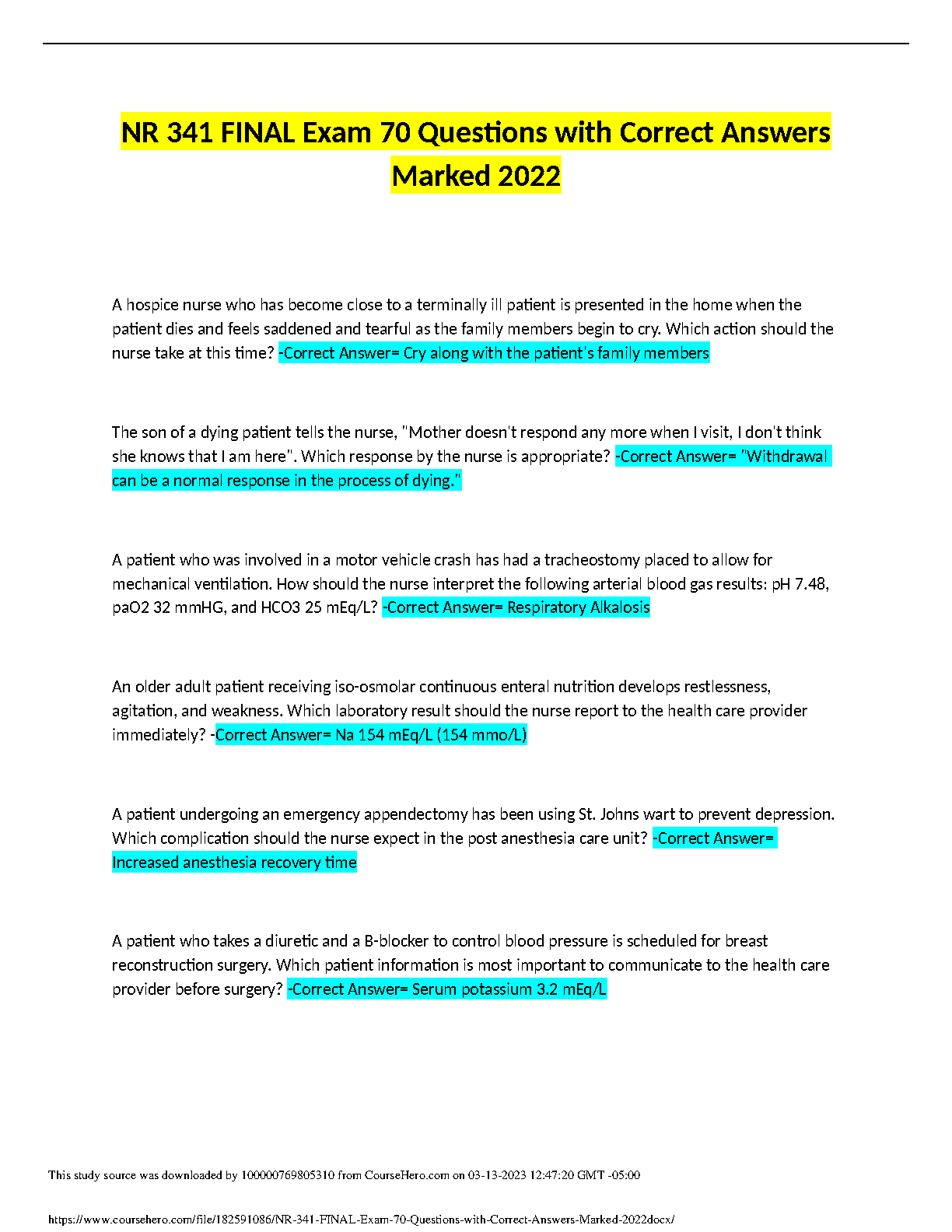 Get ready to ace your NR 341 Complex Adult Health final exam with our comprehensive test bank for the 2025/2026 academic year. This essential study guide features 70 meticulously selected questions, each paired with a verified correct answer. The questions cover critical nursing topics including end-of-life care, arterial blood gas (ABG) analysis, post-operative complications, and pre-operative patient assessment. Designed to mirror the actual exam format, this resource is your key to mastering complex adult health concepts, boosting your confidence, and passing on your first attempt. Stop stressing and start studying smart with this proven tool for success.