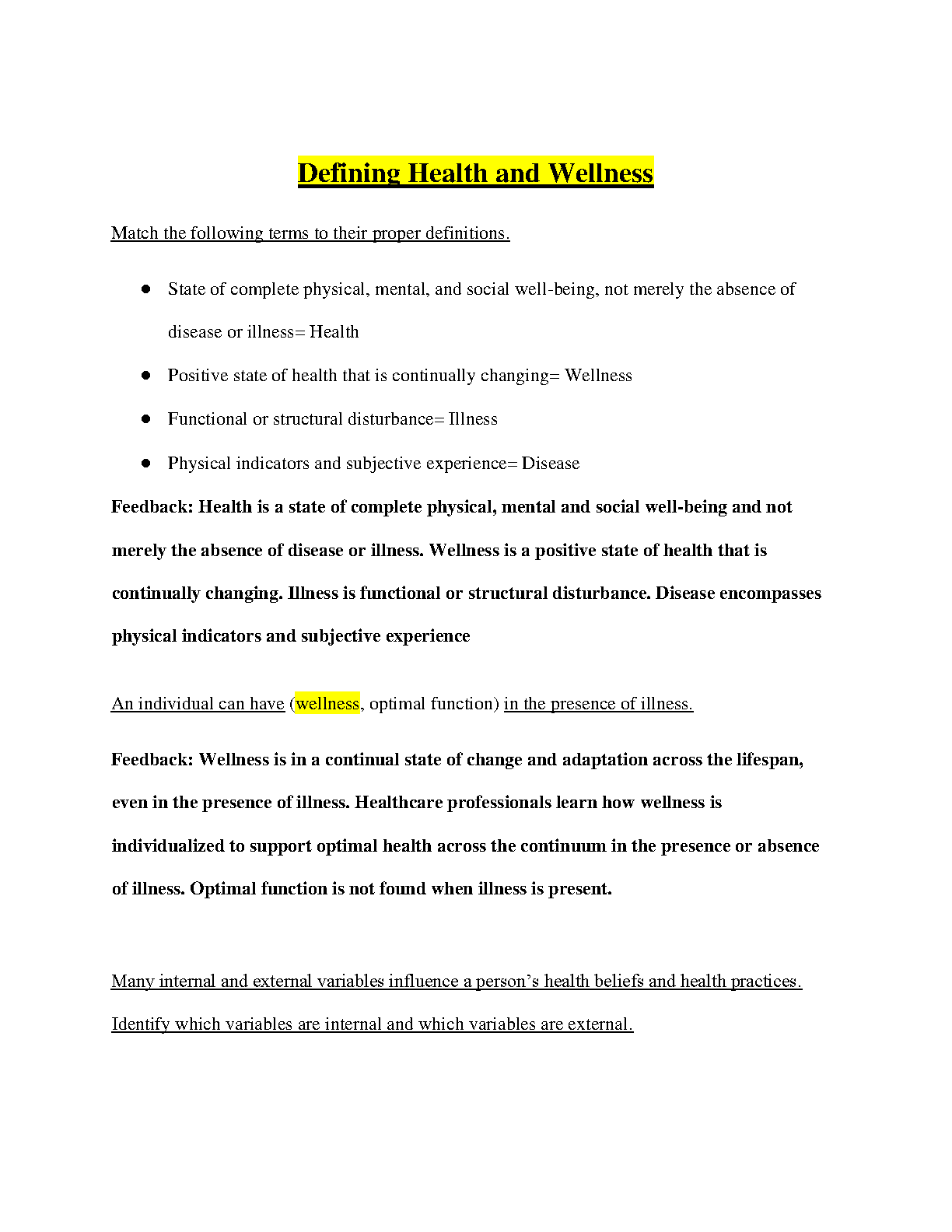 Access the complete test bank for Chapter 6: Health and Wellness, from the leading textbook 'Fundamentals of Nursing', 11th Edition by Potter, Perry, Stockert, and Hall. This resource offers a comprehensive collection of questions with detailed answers and rationales covering all core concepts. Master the fundamental definitions of health, wellness, illness, and disease. Deepen your understanding of the health-illness continuum and the internal and external variables that influence health beliefs and practices. This study aid is essential for nursing students seeking to excel in their exams and build a solid foundation for their careers.