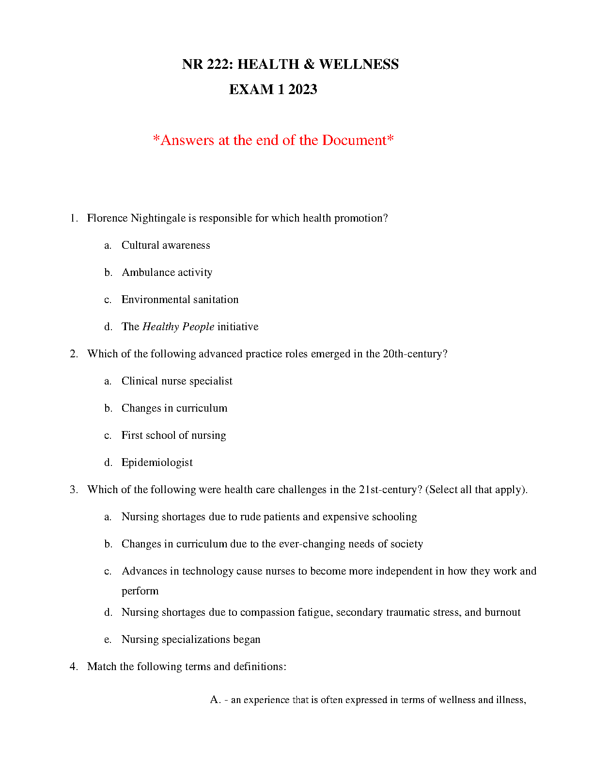 NR 222 Health & Wellness Exam 1 Test Bank with All Correct Answers (Based on Health Promotion: Translating Evidence to Practice, 3rd Edition by Elizabeth A. Edelman and Carol Lynn Mandle)