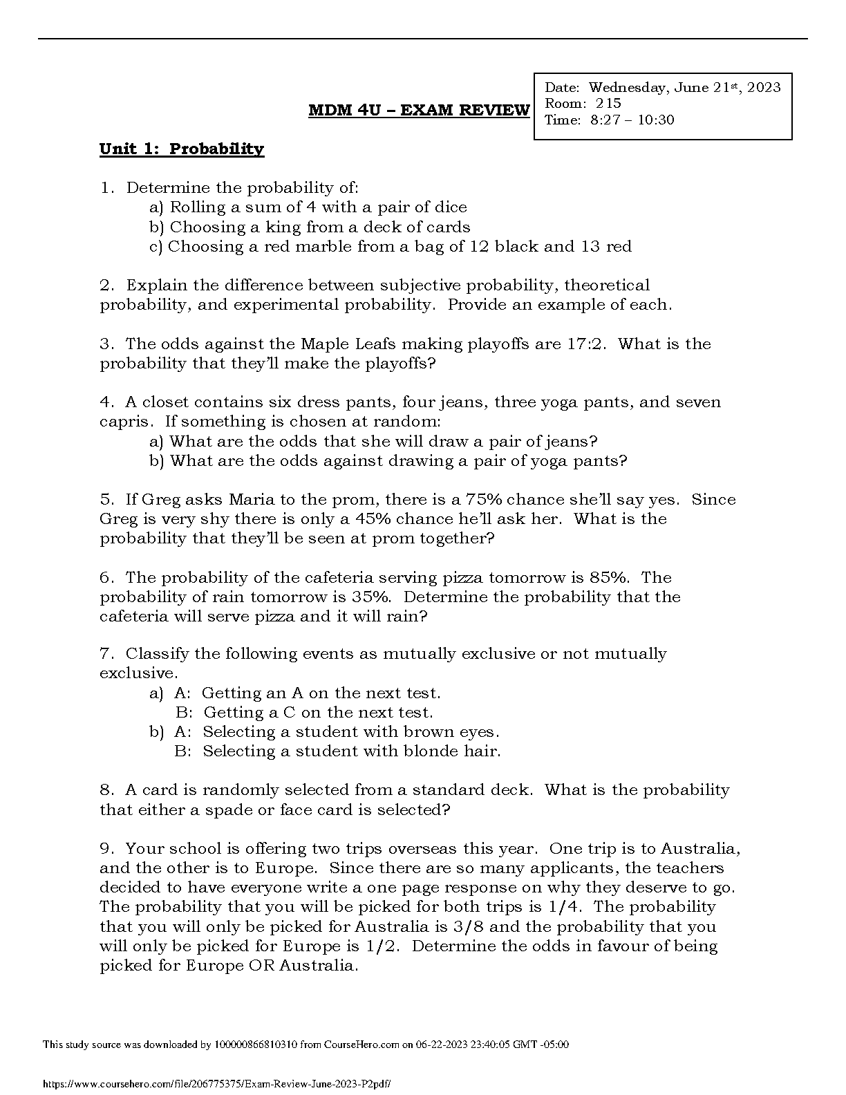 Get ready to master the fundamentals of probability and ace your MDM 4U Data Management exam with this comprehensive review guide, updated for the 2025/2026 academic year. This essential study resource provides a curated set of practice questions covering all key concepts from the Probability unit. Tackle problems on theoretical and experimental probability, calculating odds, understanding mutually exclusive events, and more. Designed to mirror real exam questions, this guide is your key to building confidence, avoiding resits, and securing a top grade on your first attempt.