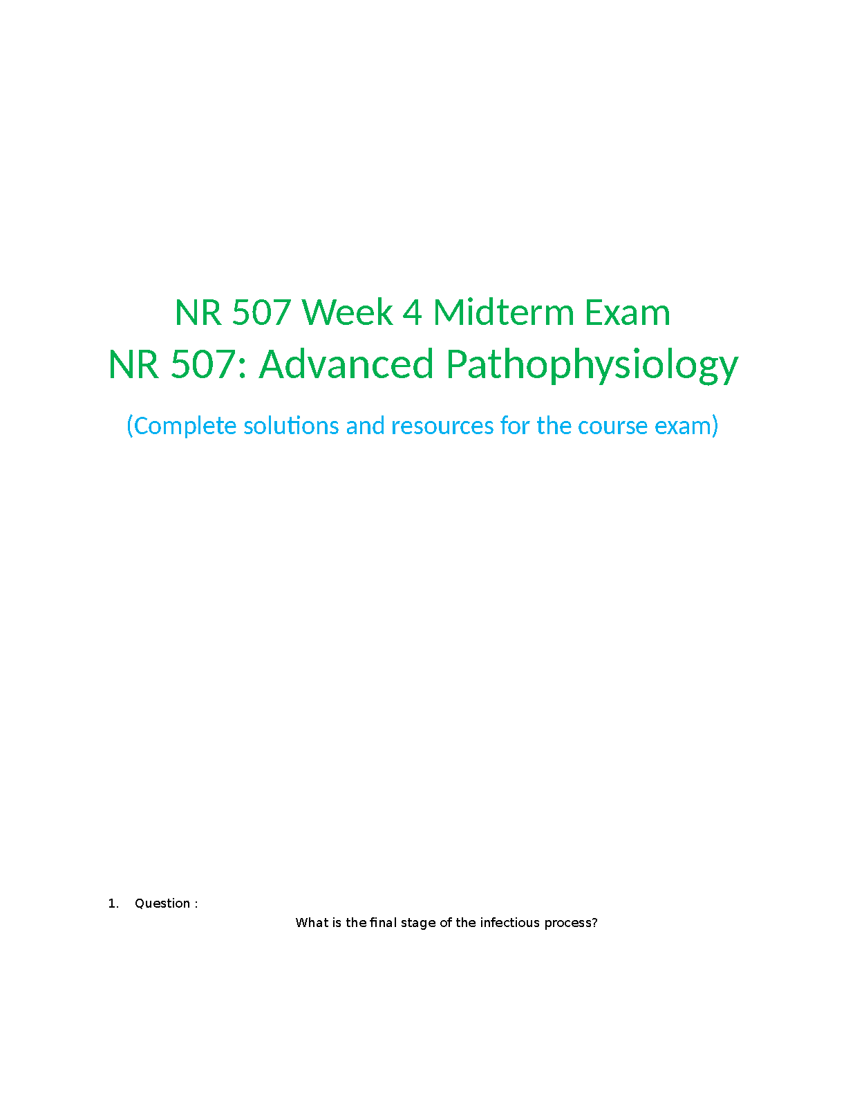 NR 507 Advanced Pathophysiology Week 4 Midterm Exam - Test Bank for Pathophysiology: The Biologic Basis for Disease in Adults and Children, 9th Edition by Kathryn L. McCance & Sue E. Huether