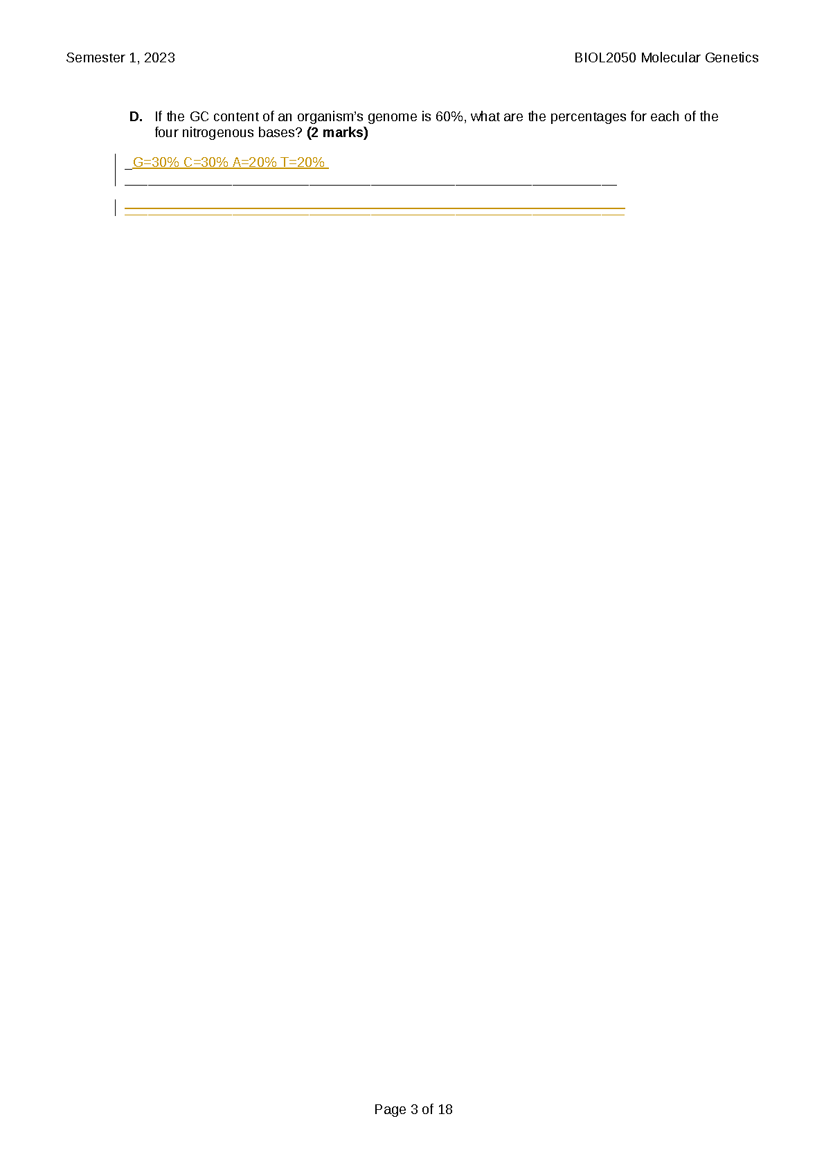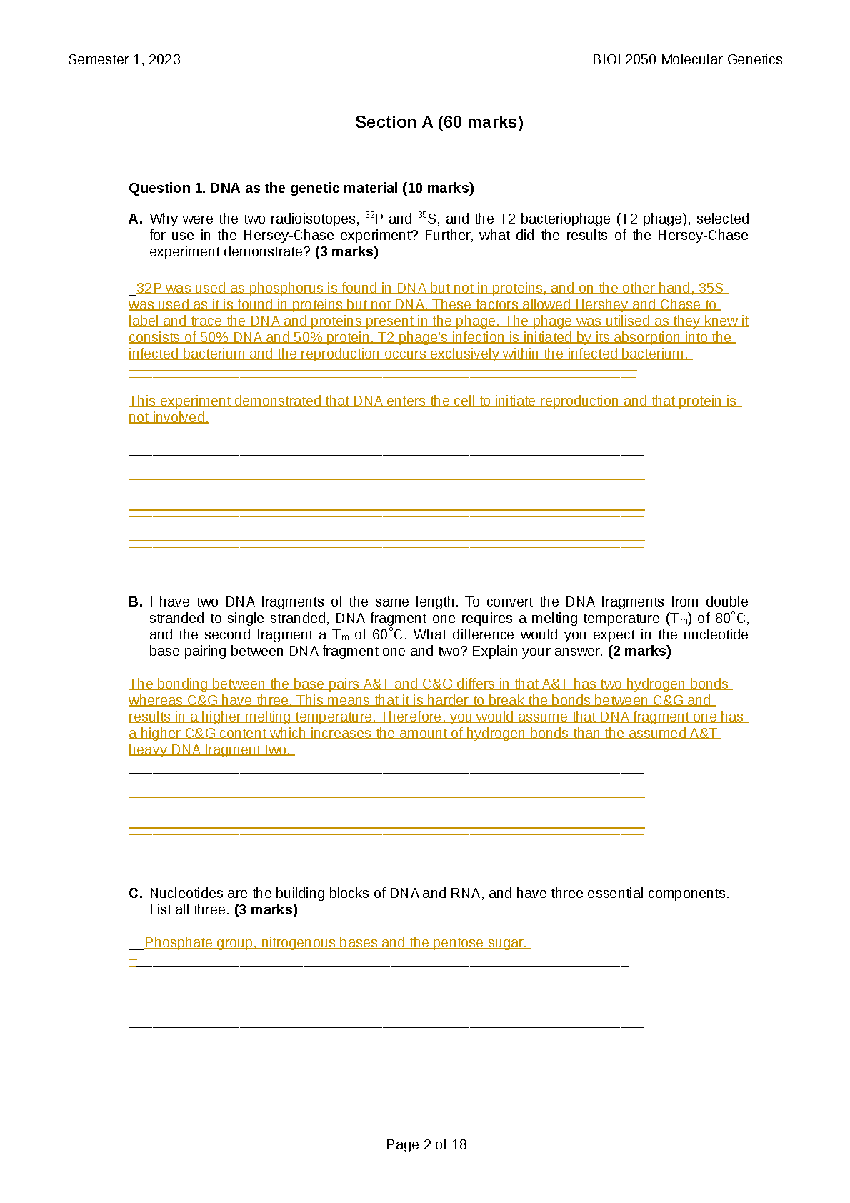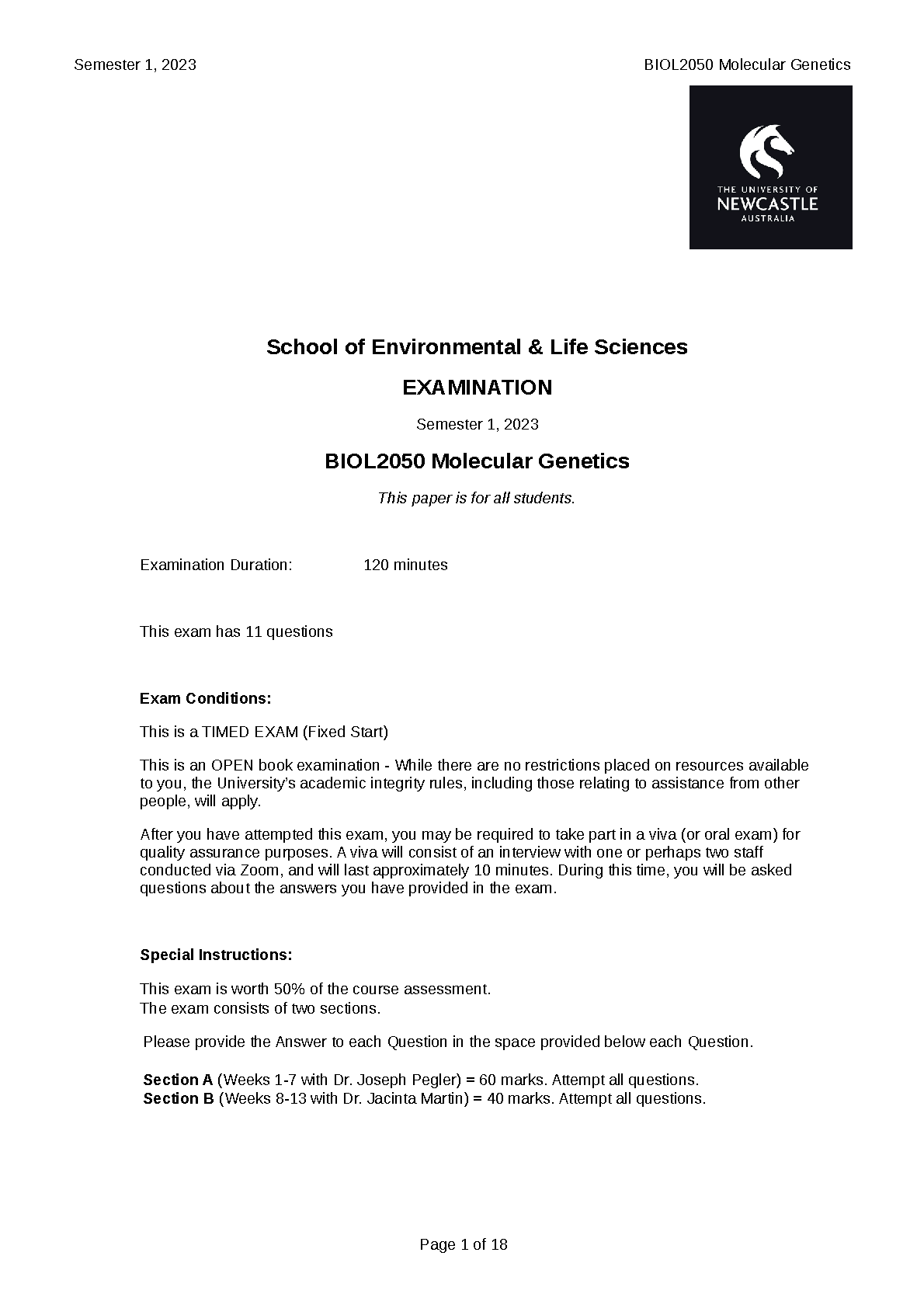 Master BIOL2050 Molecular Genetics: 2023 Exam Paper (Dr. Joseph Pegler & Dr. Jacinta Martin) | Updated 2025/2026 First-Attempt Pass Guide