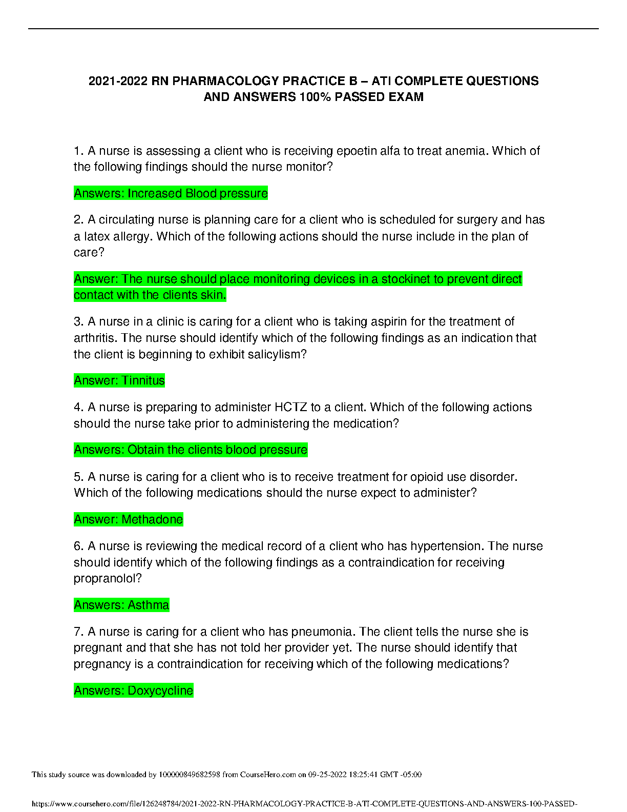 Get ready to excel in your nursing studies with our comprehensive test bank for the ATI RN Pharmacology Practice B Exam (2021-2022 version). This study guide provides a complete set of practice questions, each paired with a detailed, 100% correct answer. Designed to mirror the actual exam format, this resource helps you master critical pharmacology concepts and boost your confidence. Ideal for nursing students aiming for a top score and a guaranteed pass on their first try. Download now and start your journey to exam success!