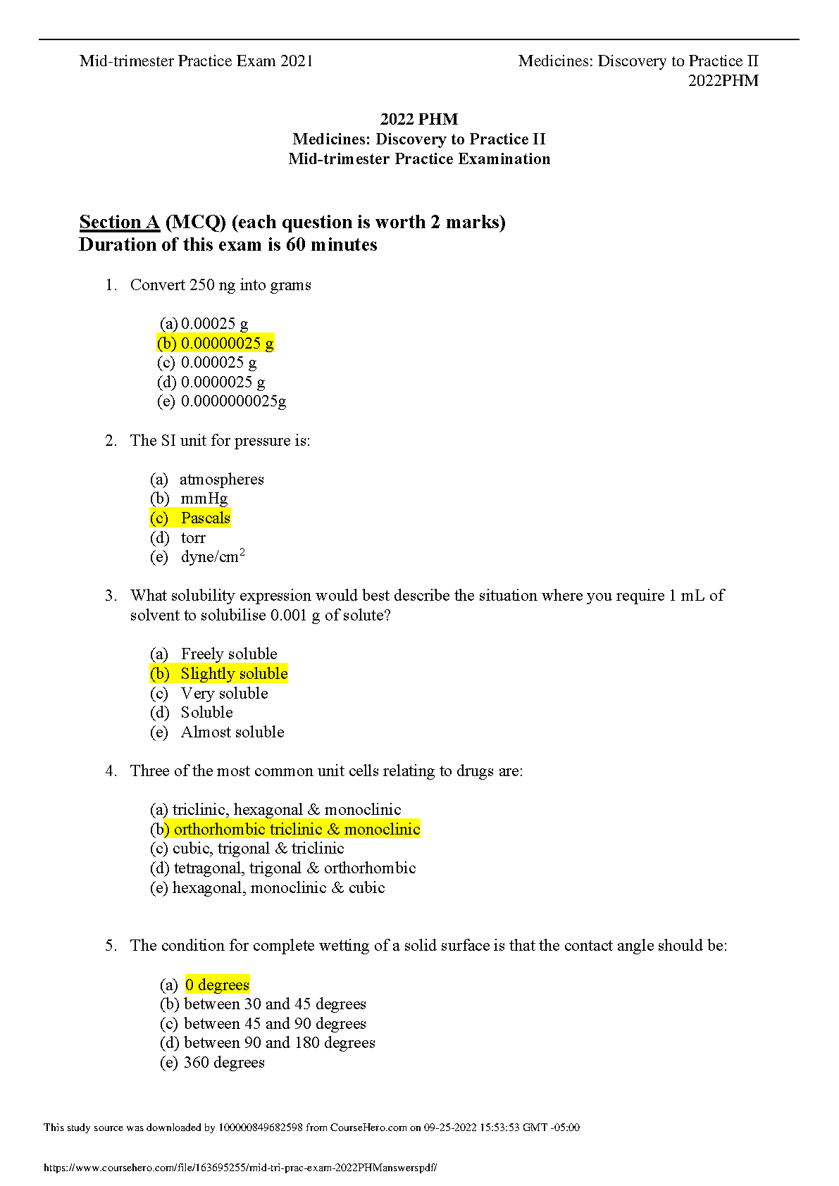 Ace your upcoming exams with this essential study resource for 2022PHM Medicines: Discovery to Practice II. This download contains the complete Mid-trimester Practice Examination, featuring detailed, highlighted answers for every multiple-choice question. Covering crucial topics such as unit conversions, SI units, solubility, drug crystal structures, and surface tension, this guide is your key to mastering the course material. Updated for the 2025/2026 academic year, this practice exam is expertly designed to help you prepare effectively, boost your confidence, and pass your exams on the first attempt, eliminating the need for resits. Get the edge you need to succeed in your pharmacy studies!