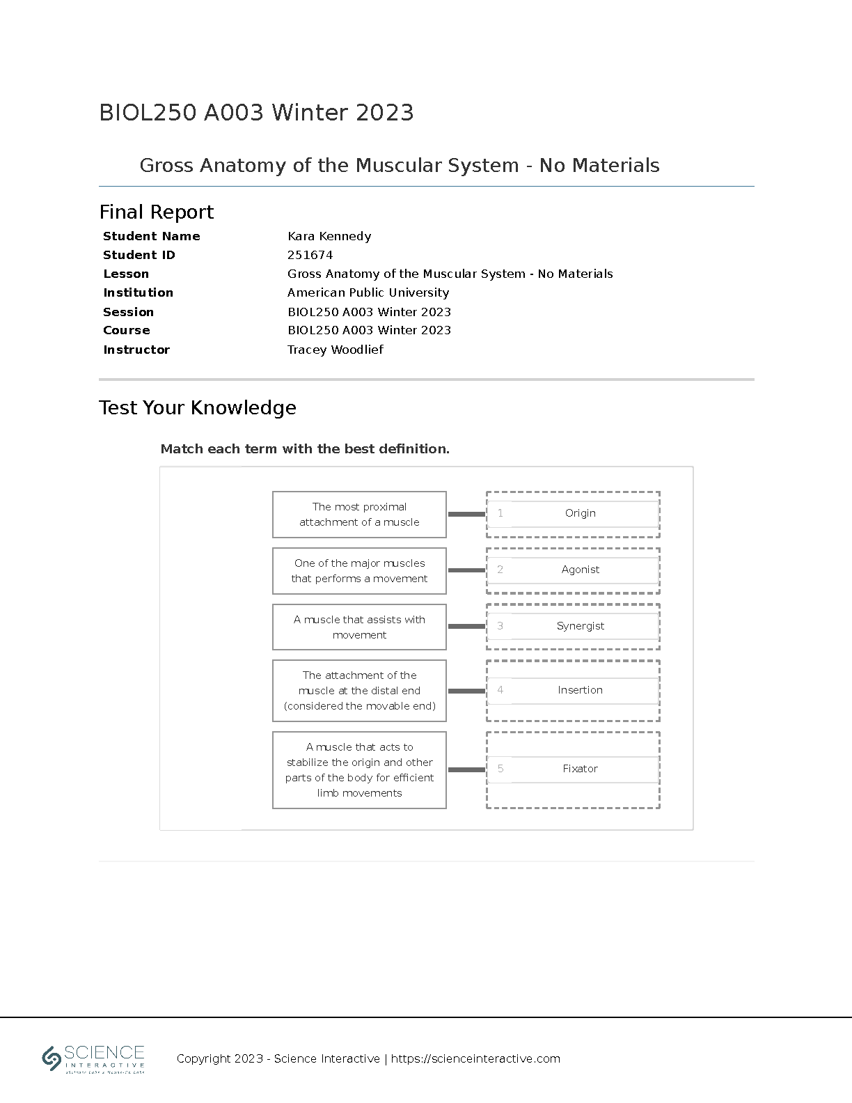 Unlock A+ results in your anatomy course with this verified final report for BIOL250: Gross Anatomy of the Muscular System. This comprehensive resource, updated for the 2025/2026 academic year, provides the complete and correct answers to the 'Test Your Knowledge' assignment. Master essential terminology such as Origin, Agonist, Synergist, Insertion, and Fixator. This guide is expertly crafted to help you grasp complex concepts effortlessly, ensuring you pass your exams on the first attempt and avoid any resits. Ideal for students at American Public University.