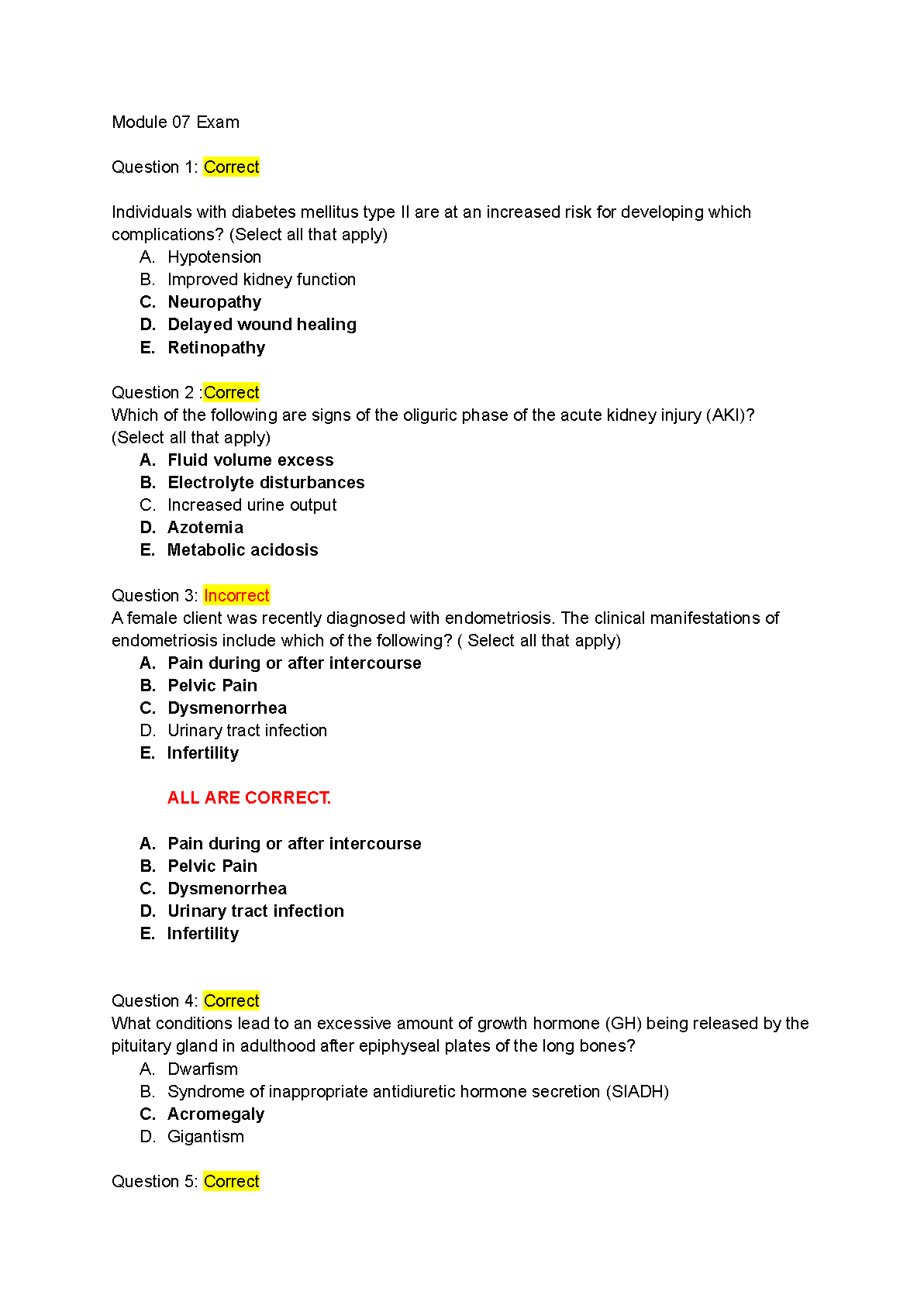 Ace your upcoming nursing exams with this comprehensive test bank for Module 07. This updated 2025/2026 study resource provides a complete set of exam questions with detailed, correct answers, designed to help you master complex topics and pass on your first try. The questions cover critical areas in pathophysiology, including complications of Type II Diabetes, signs of Acute Kidney Injury (AKI), clinical manifestations of Endometriosis, and endocrine disorders like Acromegaly. Download now to boost your confidence and secure top grades.