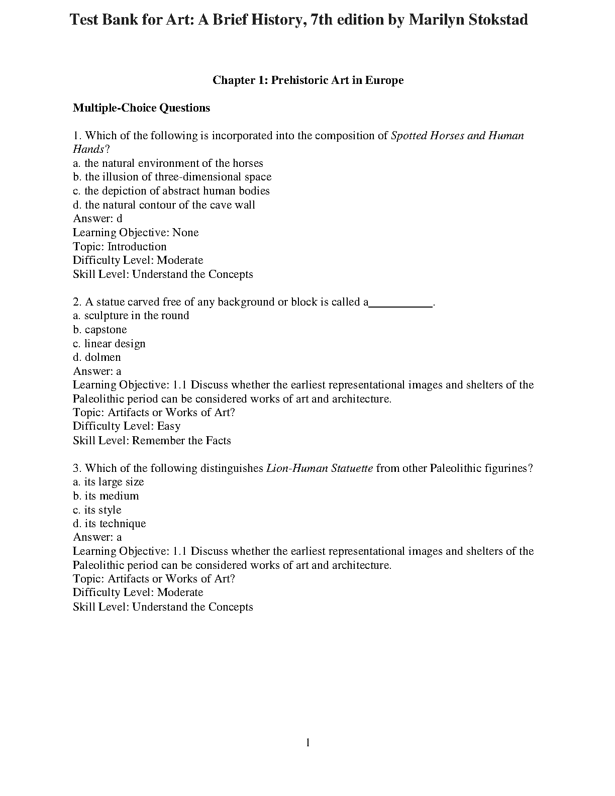 Unlock your potential and excel in your art history course with the definitive Test Bank for 'Art: A Brief History,' 7th Edition by Marilyn Stokstad and Michael W. Cothren. This essential study resource provides a comprehensive collection of exam-style questions and verified answers covering all chapters. Dive deep into topics like Prehistoric Art in Europe and beyond, with detailed explanations that clarify complex concepts. Perfect for preparing for exams, acing your assignments, and ensuring you pass on your first attempt.