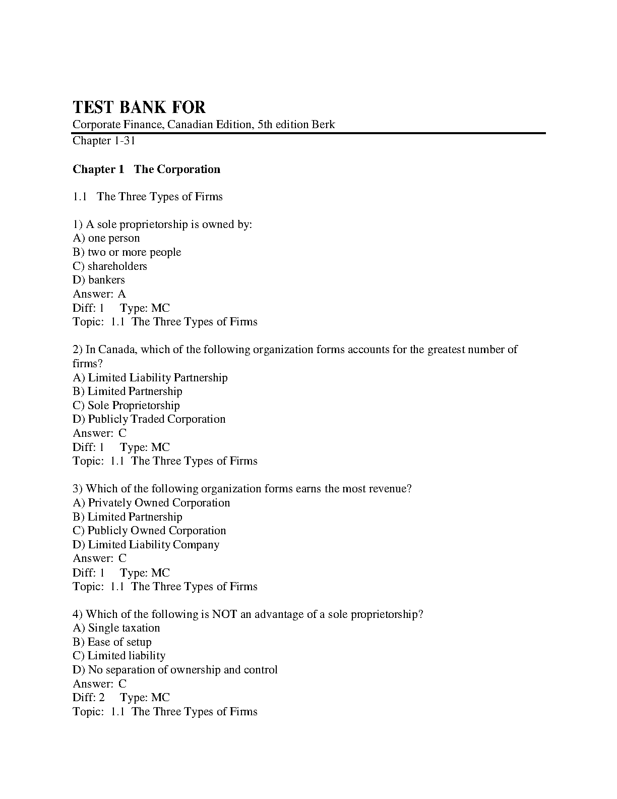 Unlock your full potential in finance with the complete Test Bank for Corporate Finance: The Core, 5th Edition, authored by Jonathan Berk and Peter DeMarzo. This indispensable resource is packed with a comprehensive range of questions, from multiple-choice to in-depth problem sets, mirroring what you'll see on your exams. Each question comes with a detailed answer and rationale, allowing you to thoroughly test your knowledge, master complex concepts, and prepare effectively to achieve top grades in your corporate finance course.