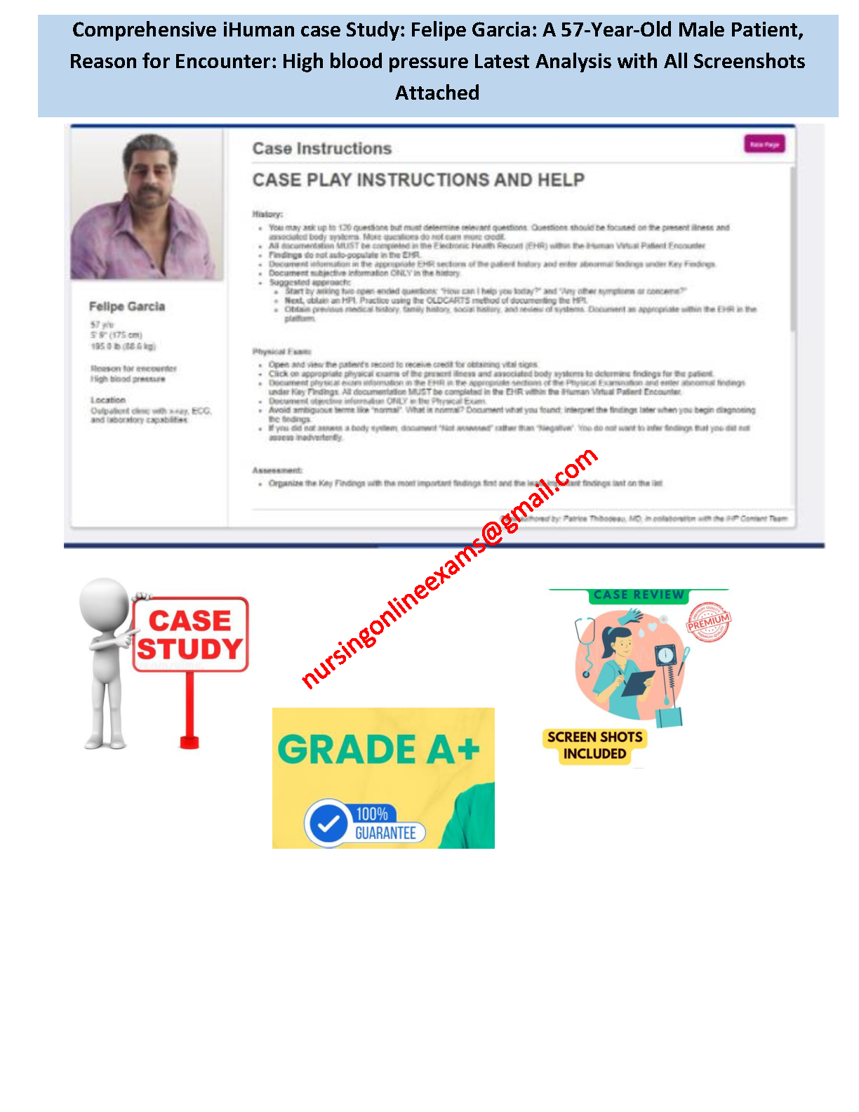 Unlock an A+ on your iHuman virtual patient encounter with our comprehensive guide for the Felipe Garcia case study. This latest 2025/2026 resource, authored by Patrice Thibodeau, MD, provides a step-by-step walkthrough of the 57-year-old male patient presenting with high blood pressure (hypertension). Our guide includes all screenshots and expert analysis, designed to help you master patient assessment, diagnostic reasoning, and management, ensuring you pass your exams on the first attempt and avoid costly resits.