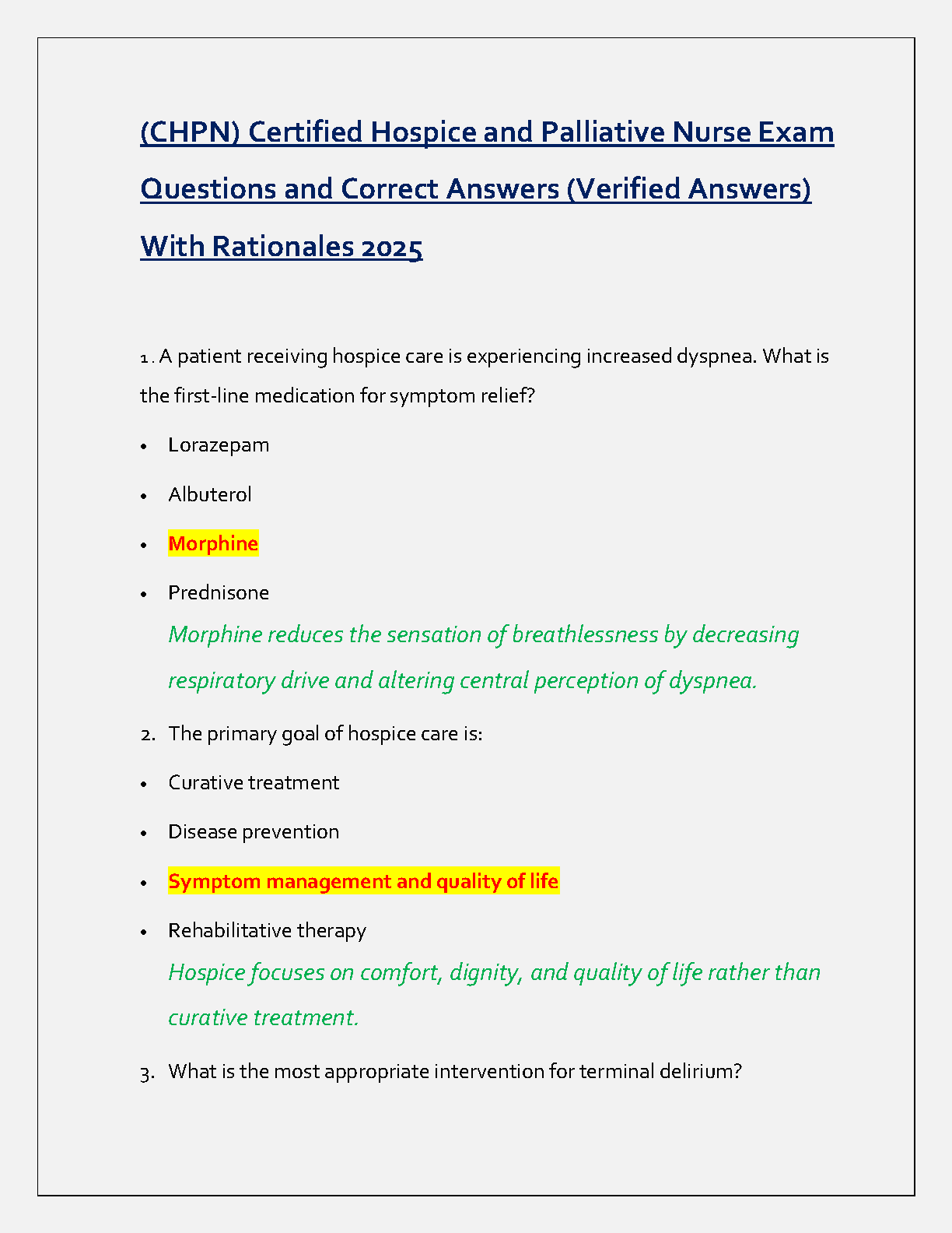 CHPN Certified Hospice and Palliative Nurse Exam Test Bank 2025: Verified Questions and Answers with In-Depth Rationales