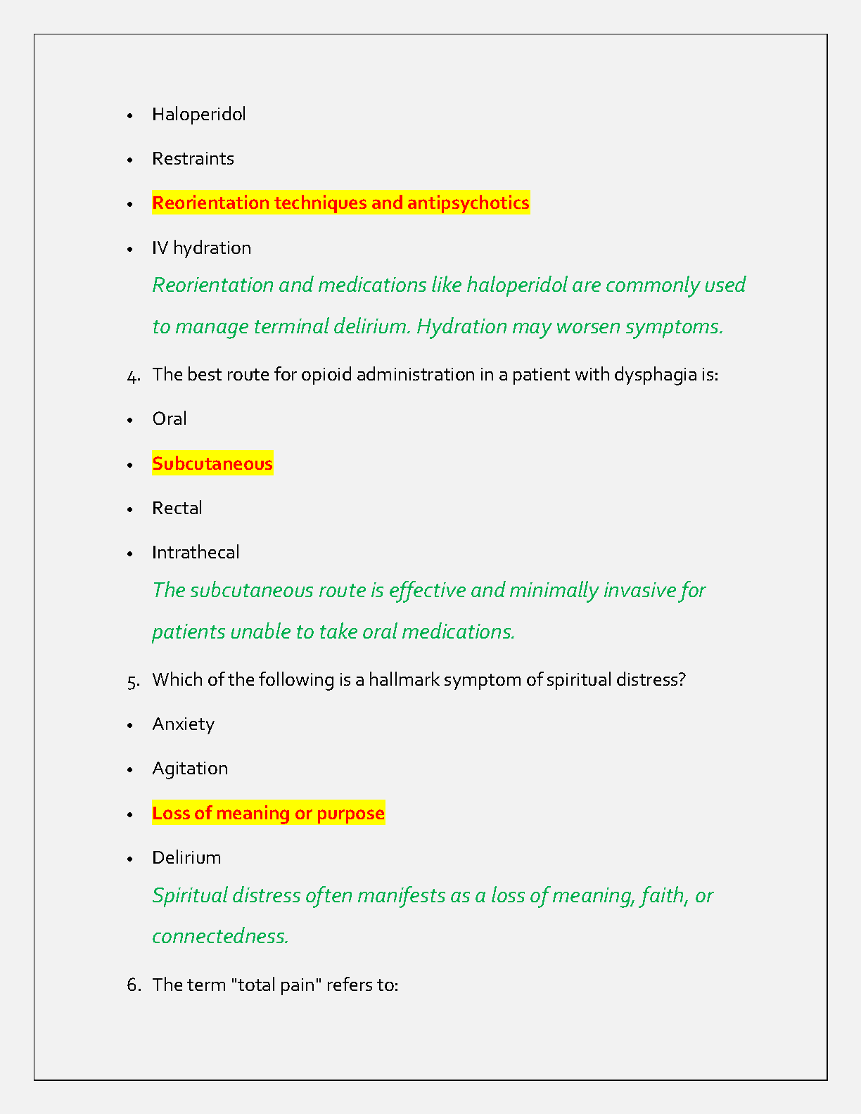 Ace your Certified Hospice and Palliative Nurse (CHPN) exam on the first try with our 2025 test bank! This complete study guide features a comprehensive collection of verified questions, accurate answers, and detailed rationales. Each explanation is designed to deepen your understanding of key concepts in hospice and palliative care, from symptom management and medication to the core principles of patient comfort and quality of life. Stop worrying about resits—this essential resource is your key to passing the CHPN certification with confidence.