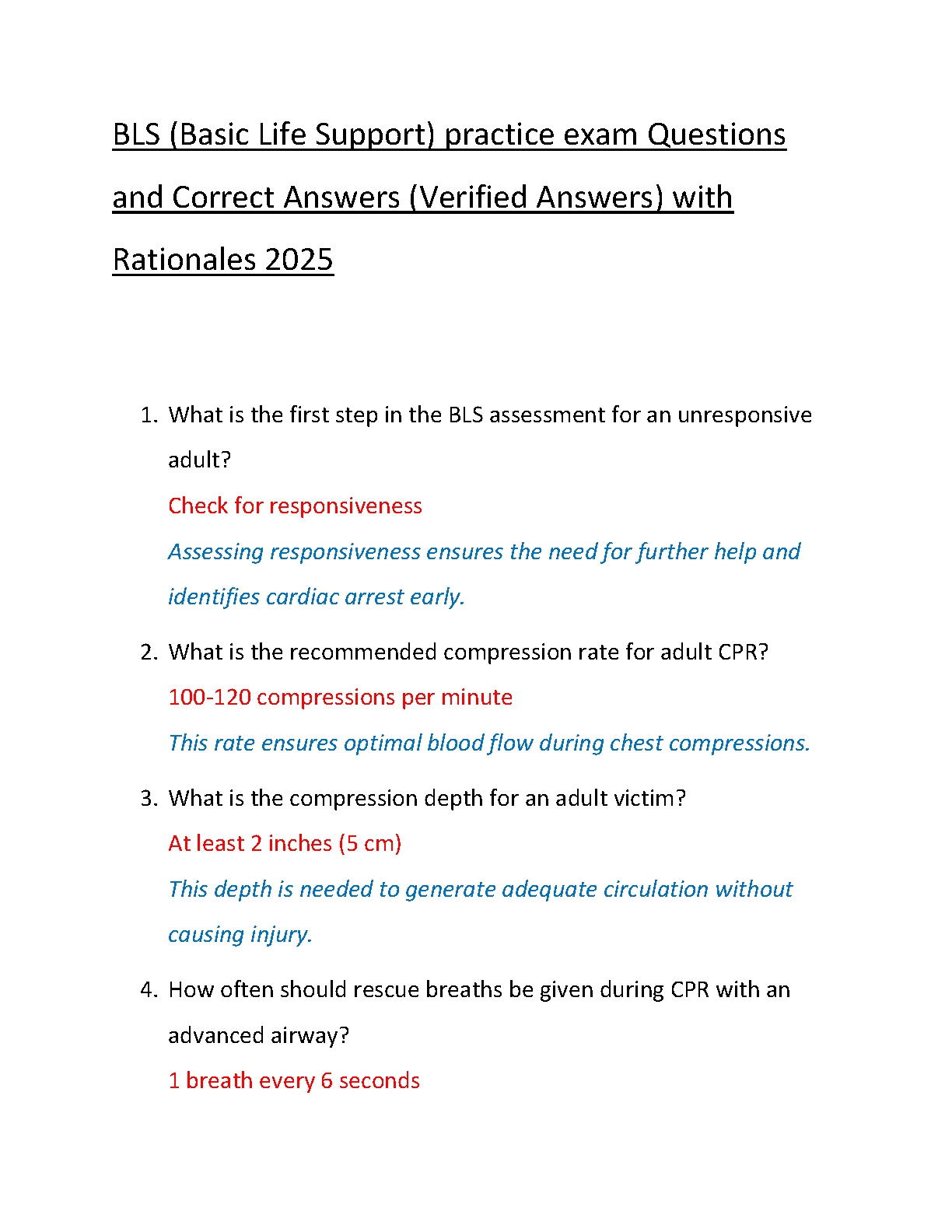 Master the essentials of Basic Life Support with our comprehensive 2025/2026 Test Bank. This essential study guide is meticulously crafted based on the latest American Heart Association (AHA) guidelines. It features a wide array of practice exam questions, 100% correct and verified answers, and in-depth rationales for each question. This resource is designed to give you the confidence and knowledge needed to excel in your BLS certification exam. Prepare effectively, understand the 'why' behind each step, and pass on your first attempt, avoiding costly resits.