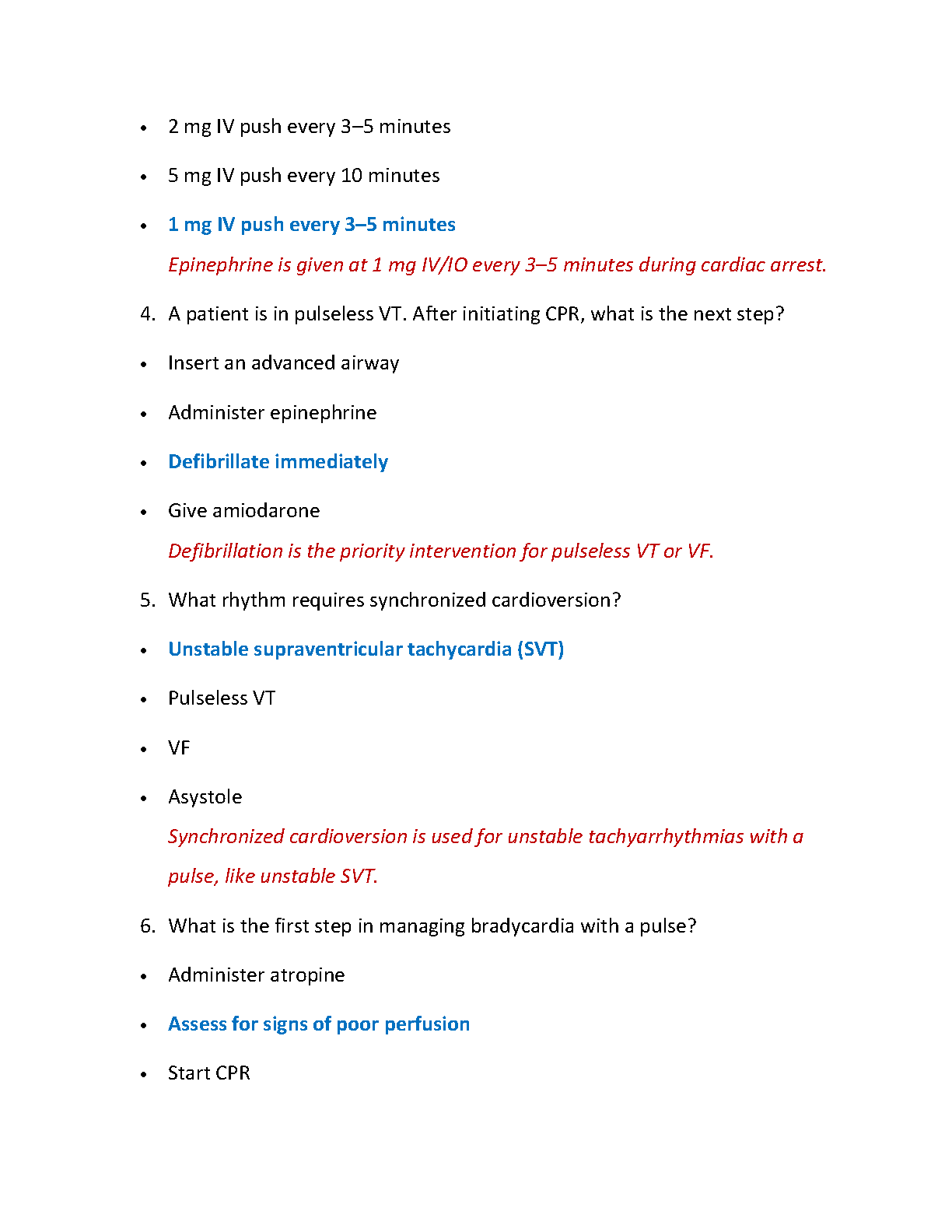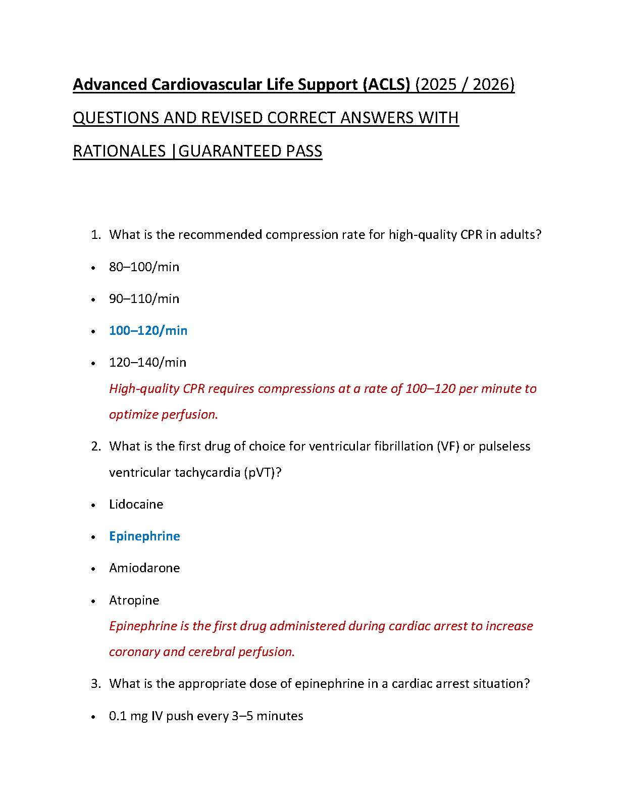 Prepare to ace your Advanced Cardiovascular Life Support (ACLS) certification with our latest 2025/2026 Test Bank. This essential study resource, based on the official American Heart Association (AHA) guidelines, provides a comprehensive collection of exam-style questions, verified correct answers, and in-depth rationales. Master critical concepts such as high-quality CPR, drug administration during cardiac arrest, and more. Our guide is meticulously designed to help you understand the 'why' behind each answer, boosting your confidence and helping you pass on your first attempt. Avoid resits and get ACLS certified with this ultimate preparation tool.