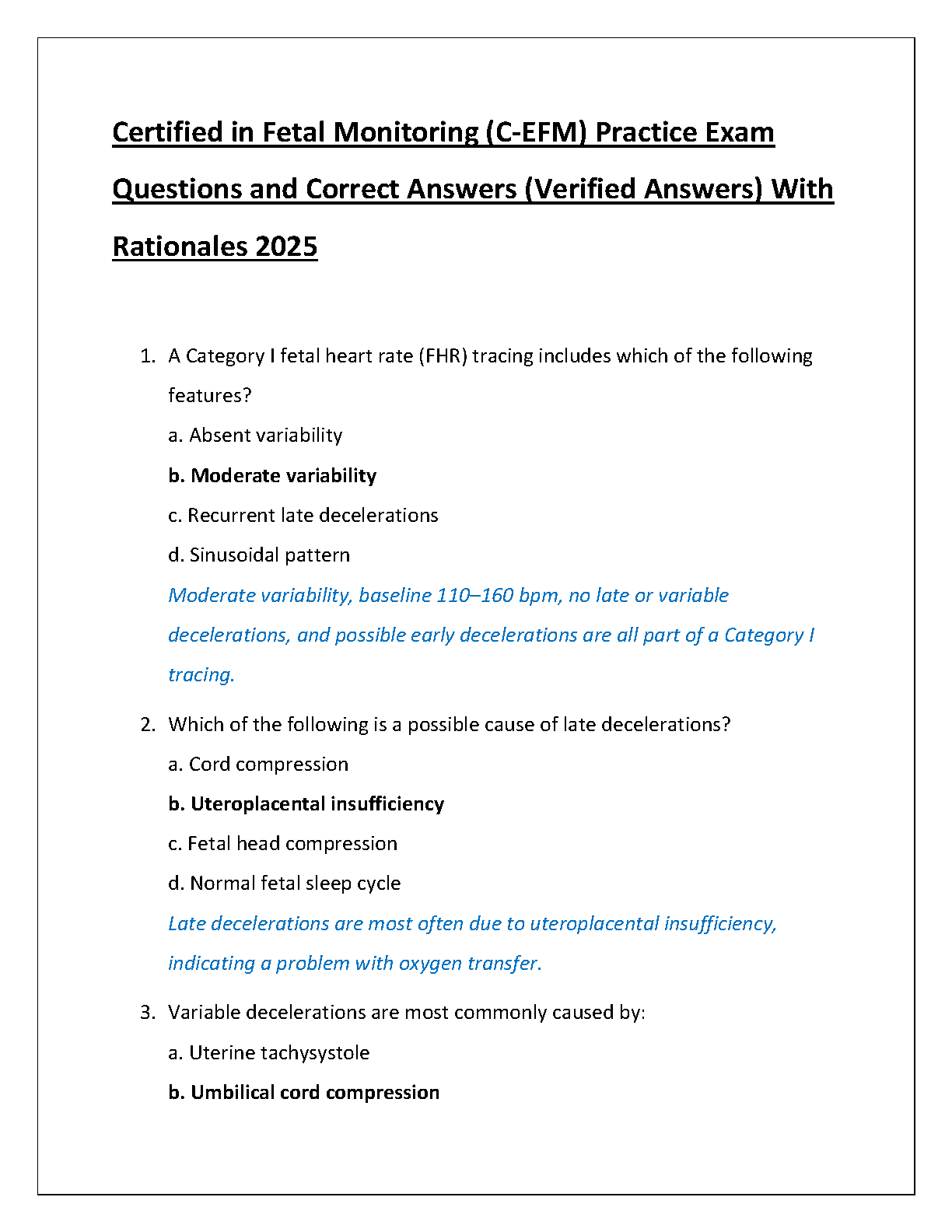 C-EFM Certified in Fetal Monitoring Test Bank 2025: Verified Q&A with Rationales to Help You Pass on Your First Attempt