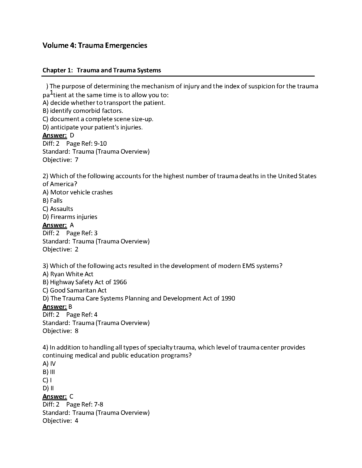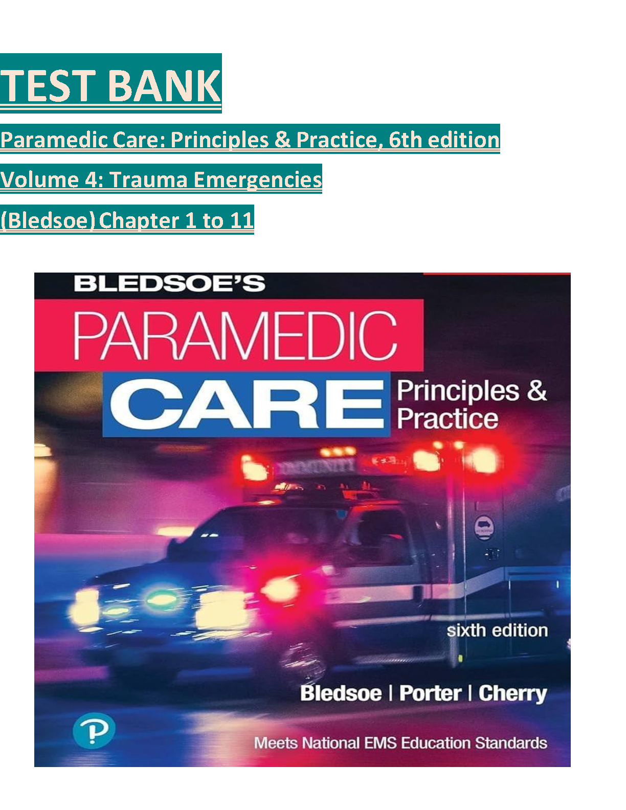 Instantly access the complete Test Bank for Volume 4: Trauma Emergencies, from the 6th Edition of Paramedic Care: Principles & Practice by Bledsoe, Porter, and Cherry. This essential study resource covers all 11 chapters, providing a comprehensive collection of exam-style questions with detailed answers. Perfect for paramedic students, this guide will help you master critical trauma concepts, test your understanding, and excel in your examinations.